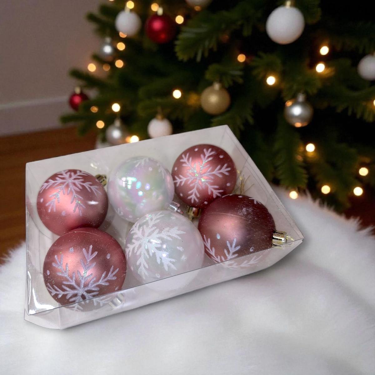 Varázsold ünnepivé otthonod ezzel a gyönyörű rózsaszín-fehér karácsonyi gömb készlettel, amelyet holografikus, csillogó pelyhes minta díszít.