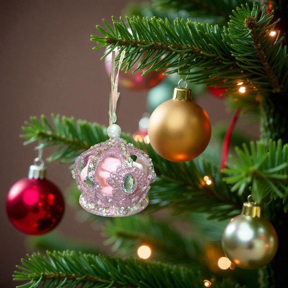 Ez a karácsonyfadísz rózsaszín korona csillámmal és kristályokkal díszített, amely eleganciát és ünnepi hangulatot kölcsönöz a karácsonyfának.