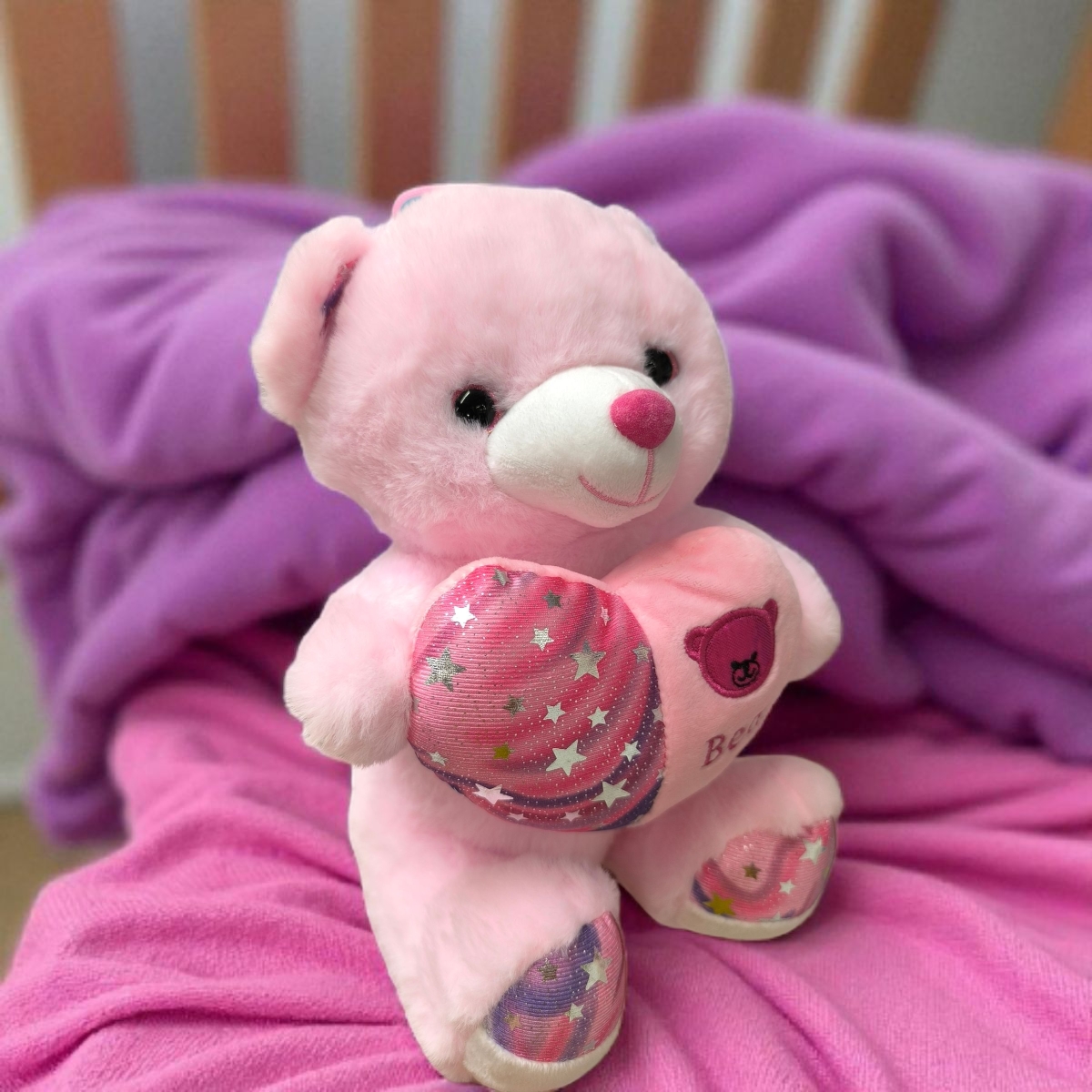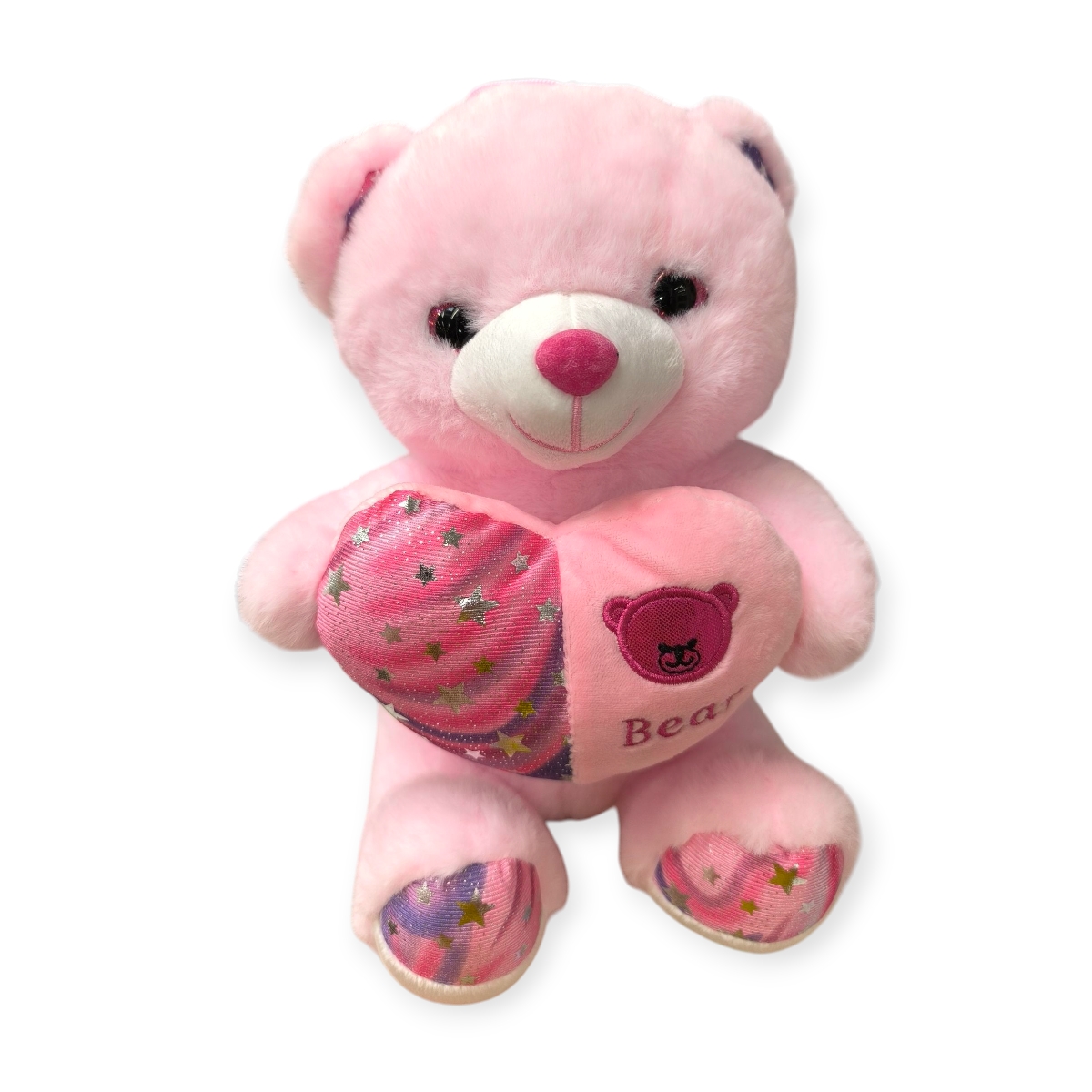 Puha rózsaszín plüssmackó csillogó ezüst fólia csillagokkal és kedves rózsaszín szívvel.