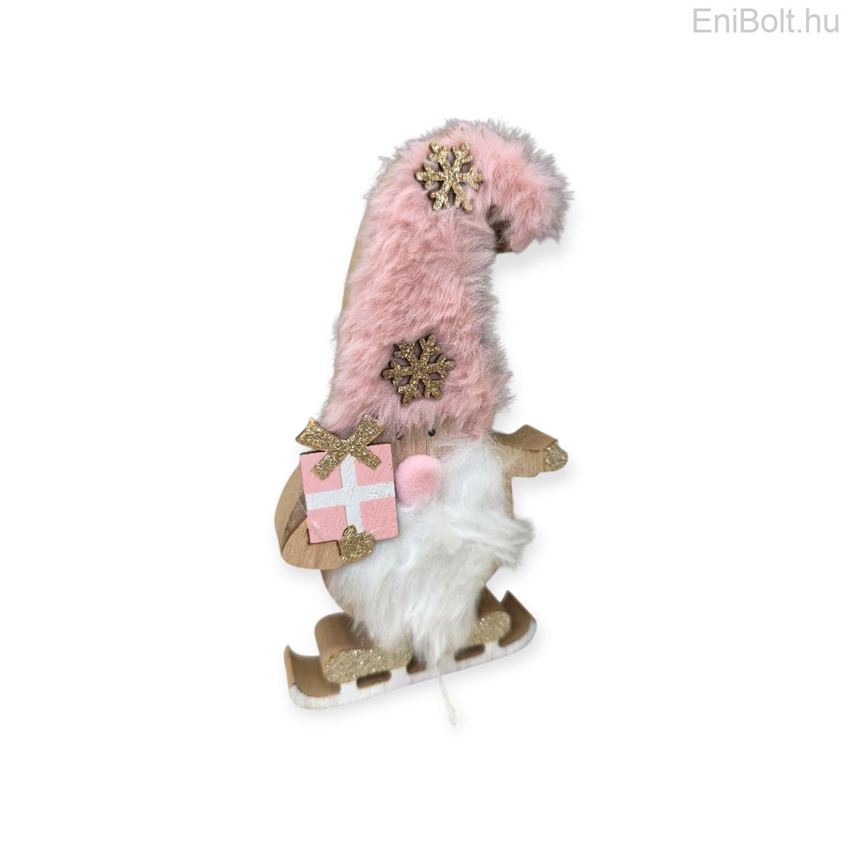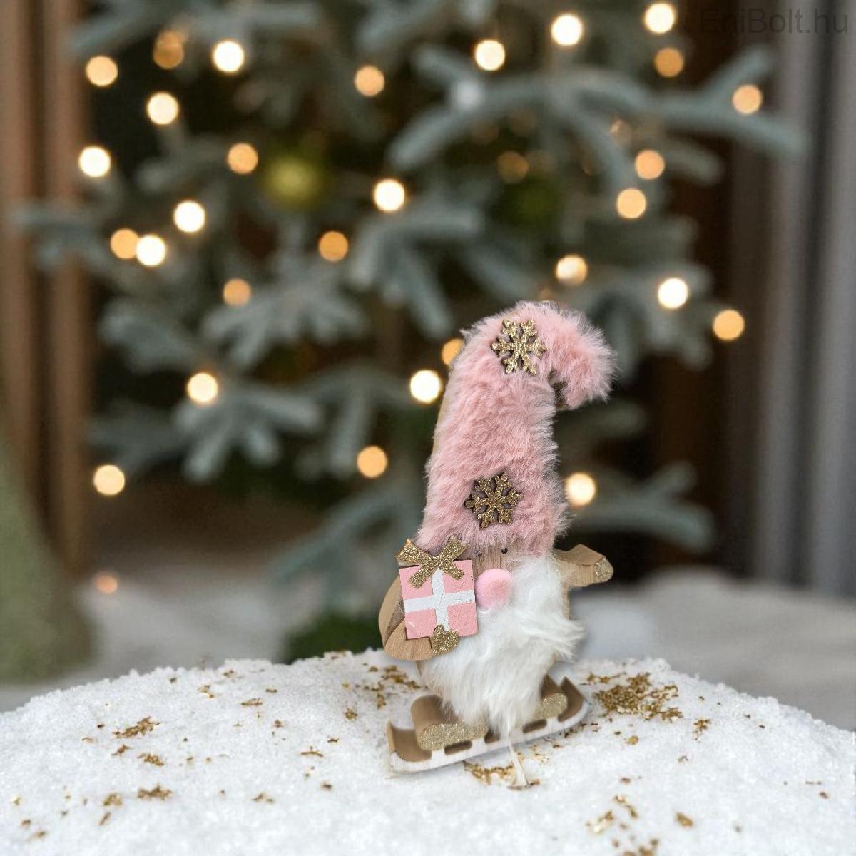 Bájos asztali karácsonyi dekoráció, amely egy rózsaszín prémes sapkás gnóm figurát ábrázol sílécekkel és arany részletekkel díszítve. Kezében csillogó ajándékdobozt tart, ami még különlegesebbé teszi az ünnepi hangulatot.