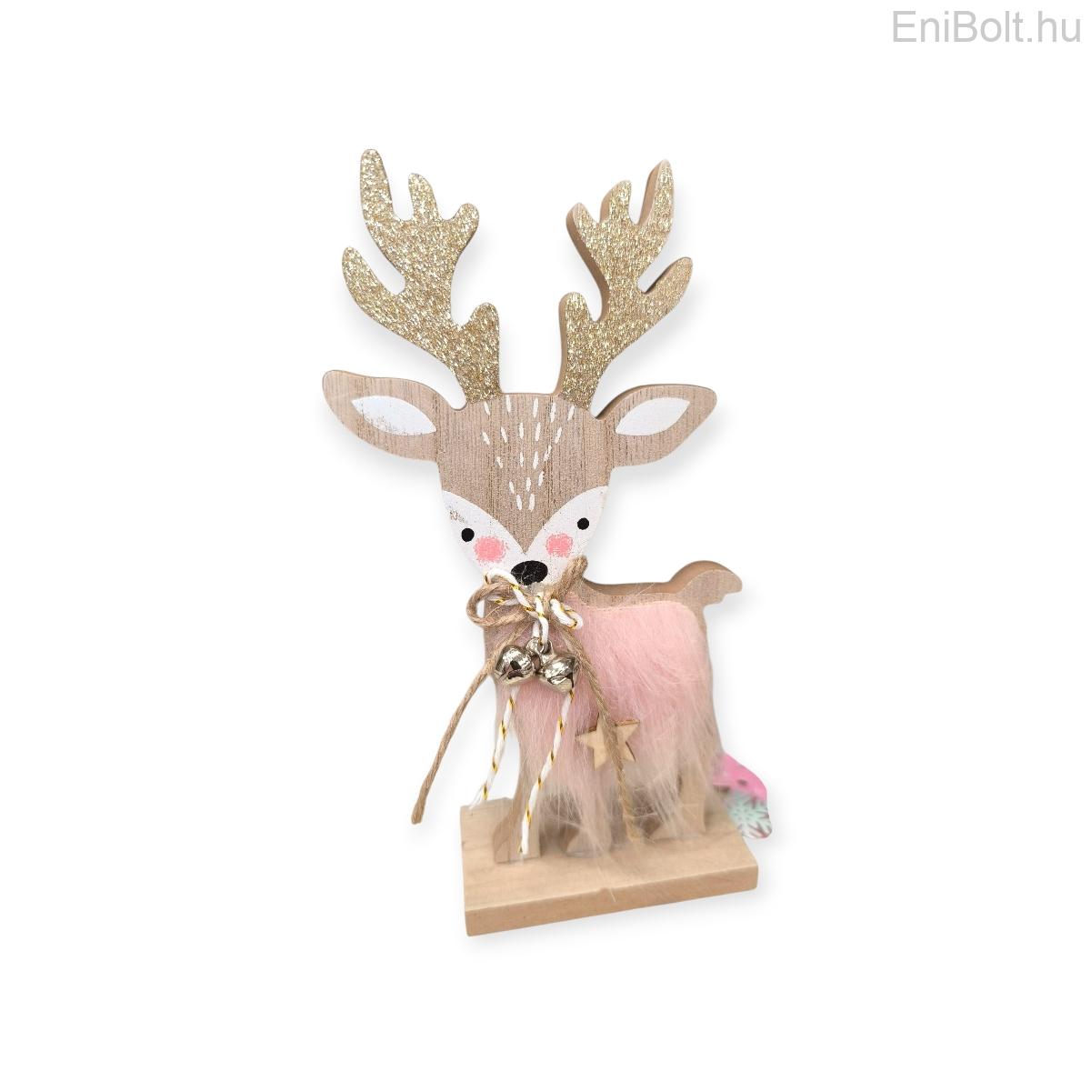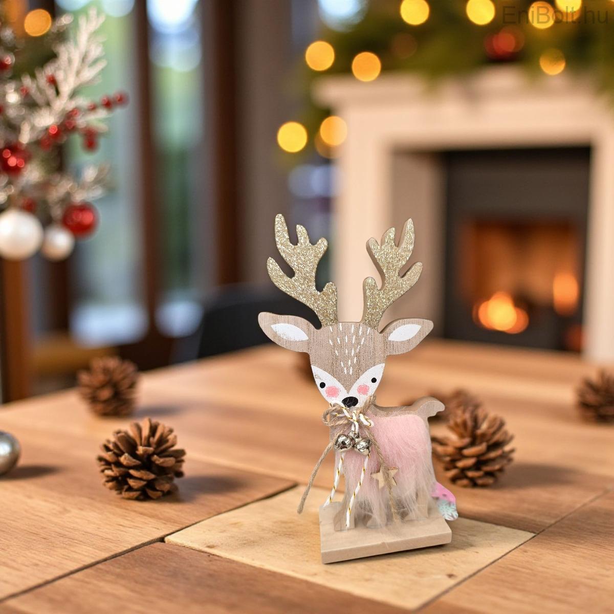 Elegáns fából készült karácsonyi dekoráció, amely egy szarvasmintás díszt ábrázol puha rózsaszín szőrmével és apró haranggal. A pezsgő-bézs csillogó részletek finom, ünnepi fényt kölcsönöznek otthonodnak.