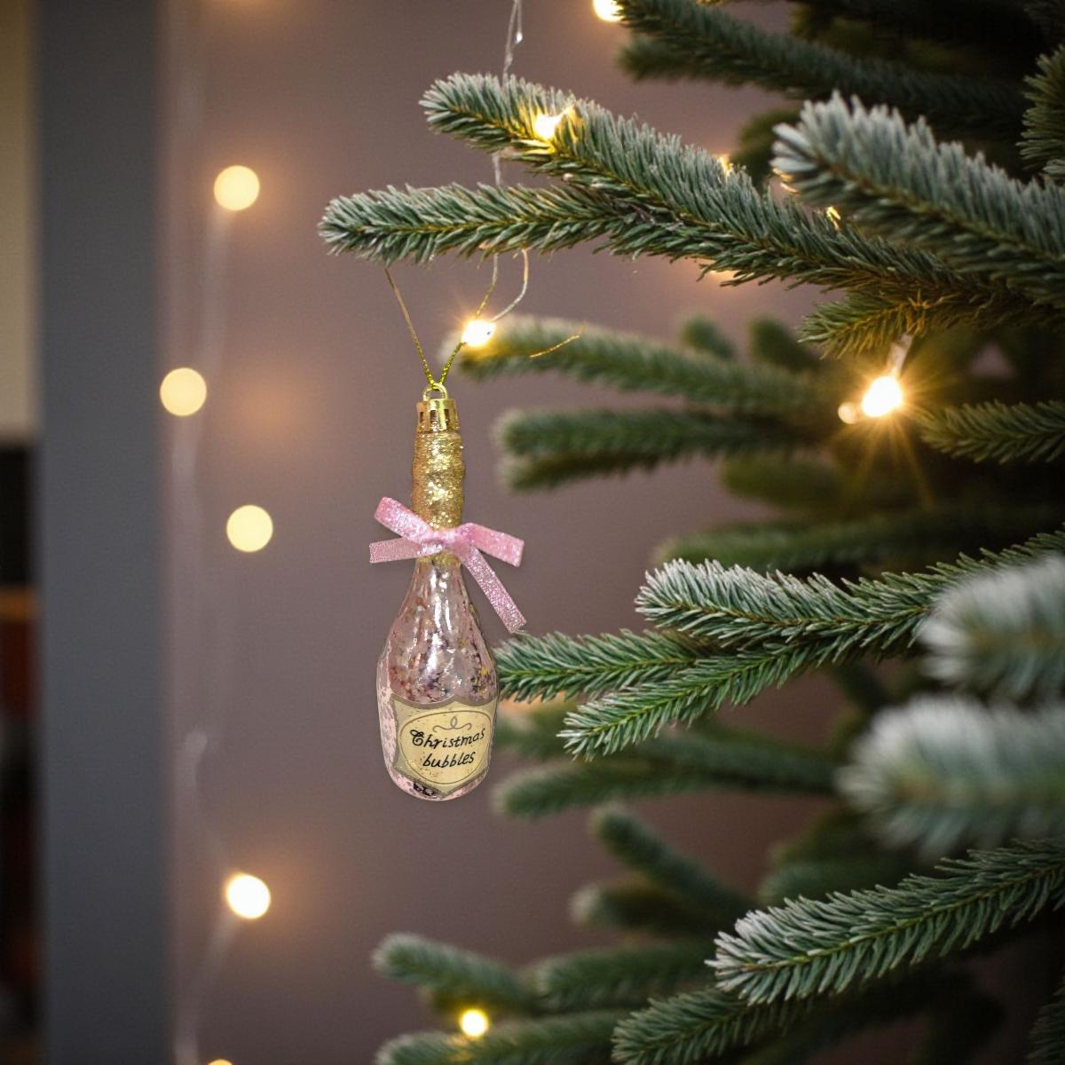 Elegáns karácsonyfadísz üveg formában, „Karácsonyi buborékok” felirattal, rózsaszín masnival és arany csillogással. Egyedi, modern kiegészítő, amely fényt és luxust visz a karácsonyfára.