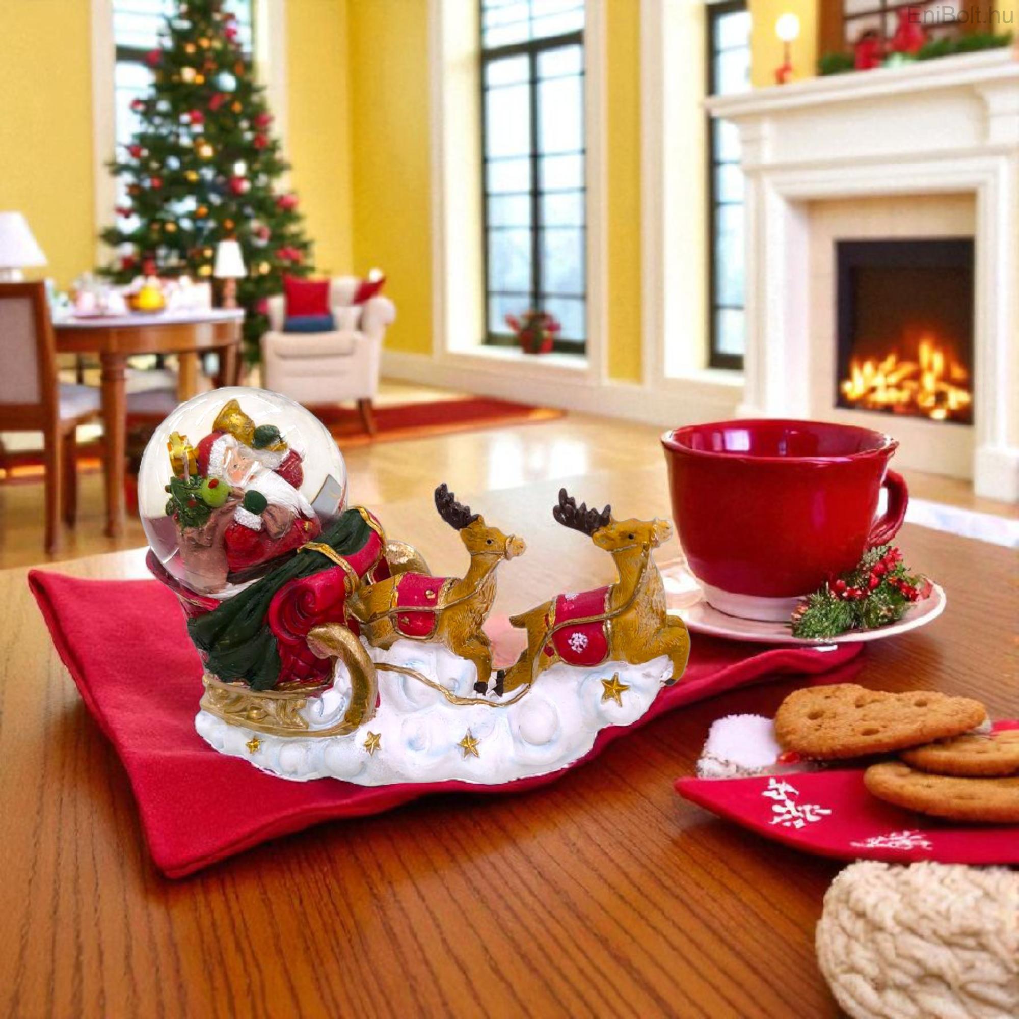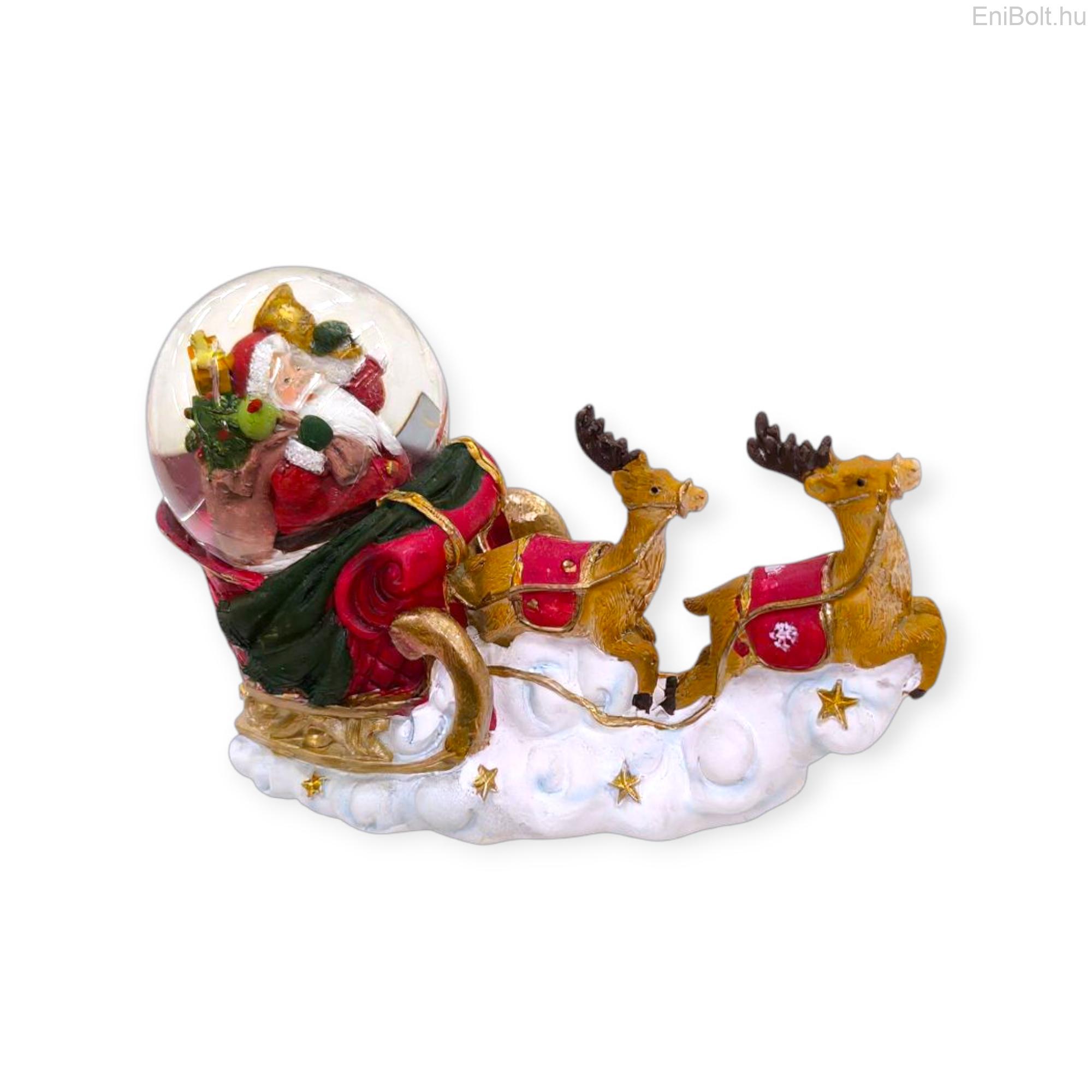 Varázslatos karácsonyi hógömb, amelyben a Mikulás szánon ülve repül két aranyszarvassal a hófelhők felett. A részletgazdag kidolgozás és a csillogó festés életre kelti a téli mesevilág hangulatát.