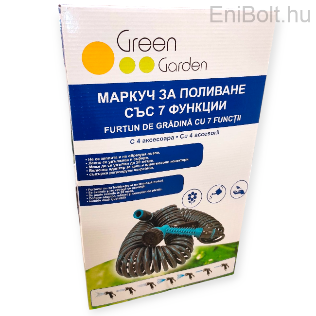 A 20 méter hosszú tömlő automatikusan visszahúzódik, helytakarékos megoldás, különösen kisebb kertekben.