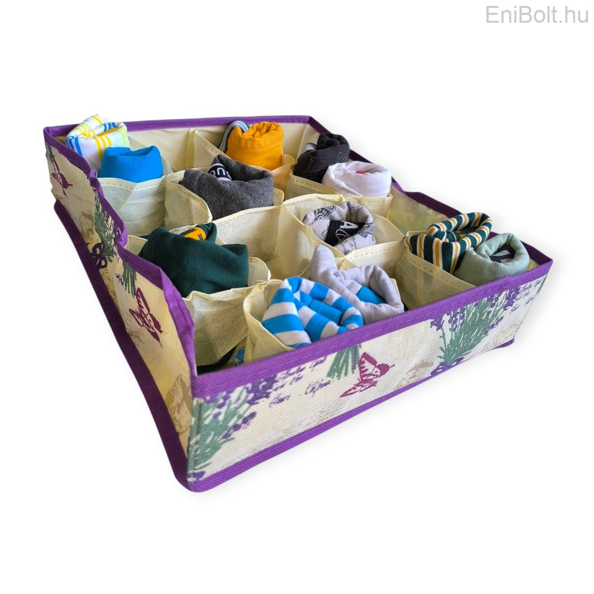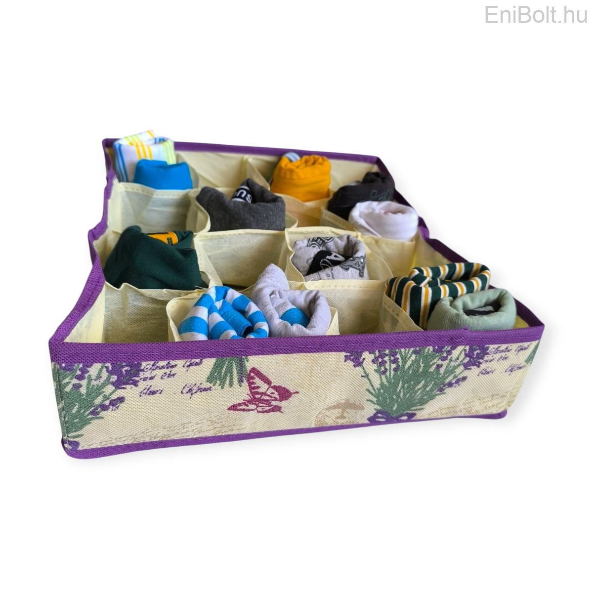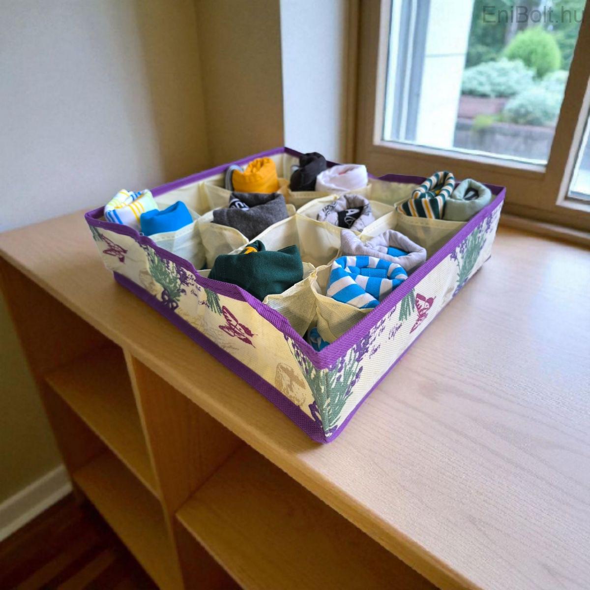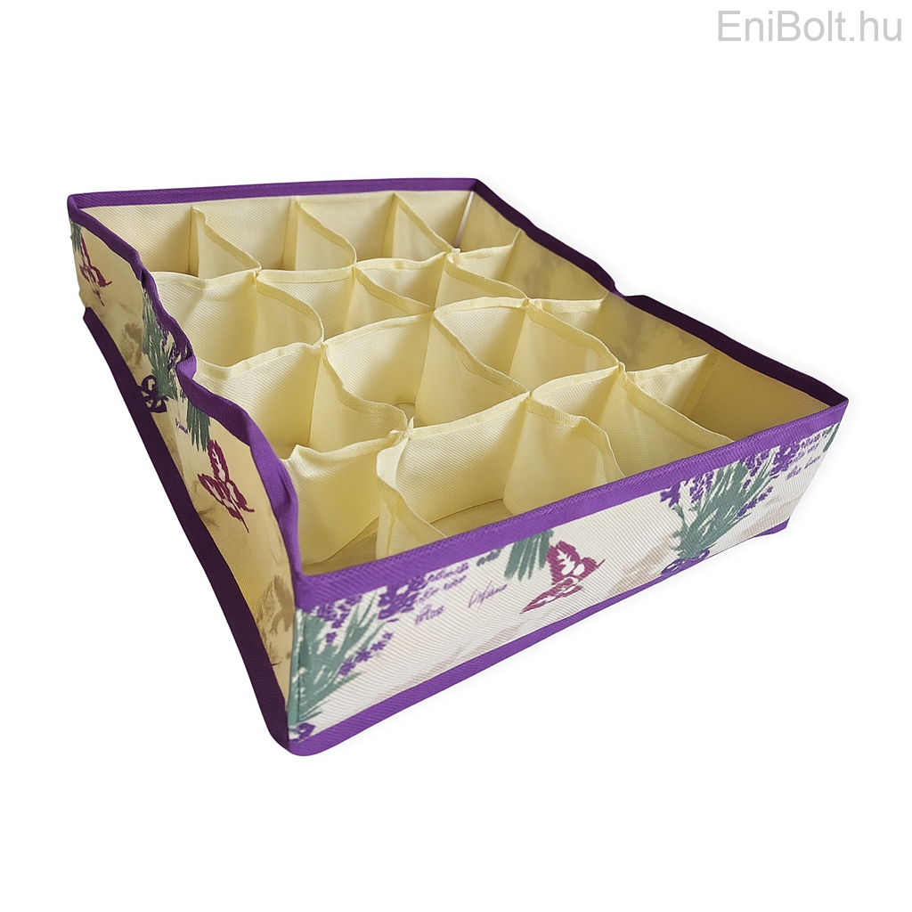 A fiókrendező doboz 12 rekeszével segít rendszerezni fehérneműt, zoknit, kiegészítőket vagy kisebb ruhadarabokat. Strapabíró anyaga kifejezetten a penész és a nedvesség megelőzésére lett tervezve, miközben biztosítja a megfelelő légáramlást. Látványos levendulás mintája dekoratívvá teszi a tárolást.