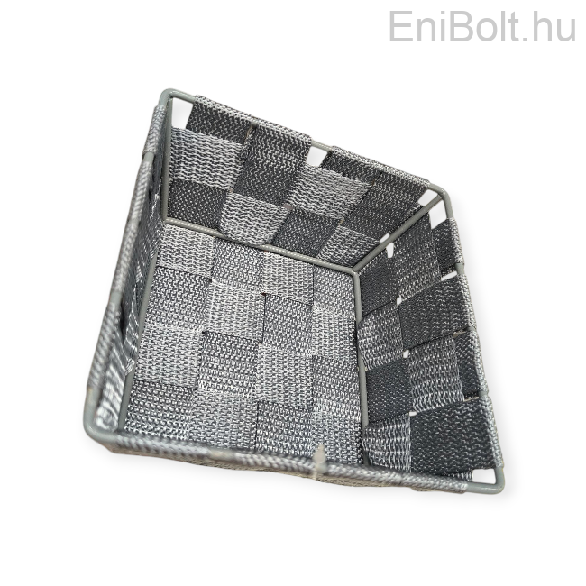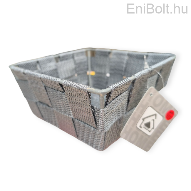 A szürke fonott mintás fém tárolókosár praktikus és dekoratív megoldás kisebb tárgyak rendszerezéséhez. Erős fémkerete stabil tartást biztosít, a fonott hatású polipropilén bevonat pedig stílusos megjelenést kölcsönöz. Ideális fürdőszobába, konyhába, hálószobába vagy irodába.