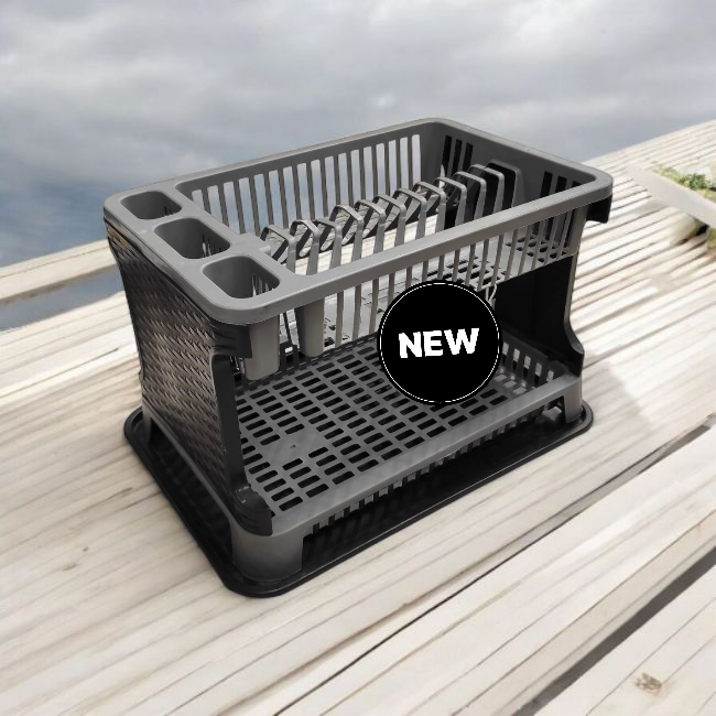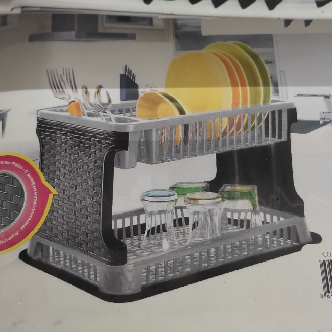 Két szintes edényszárító szürke műanyagból, különleges rattan hatású mintával.