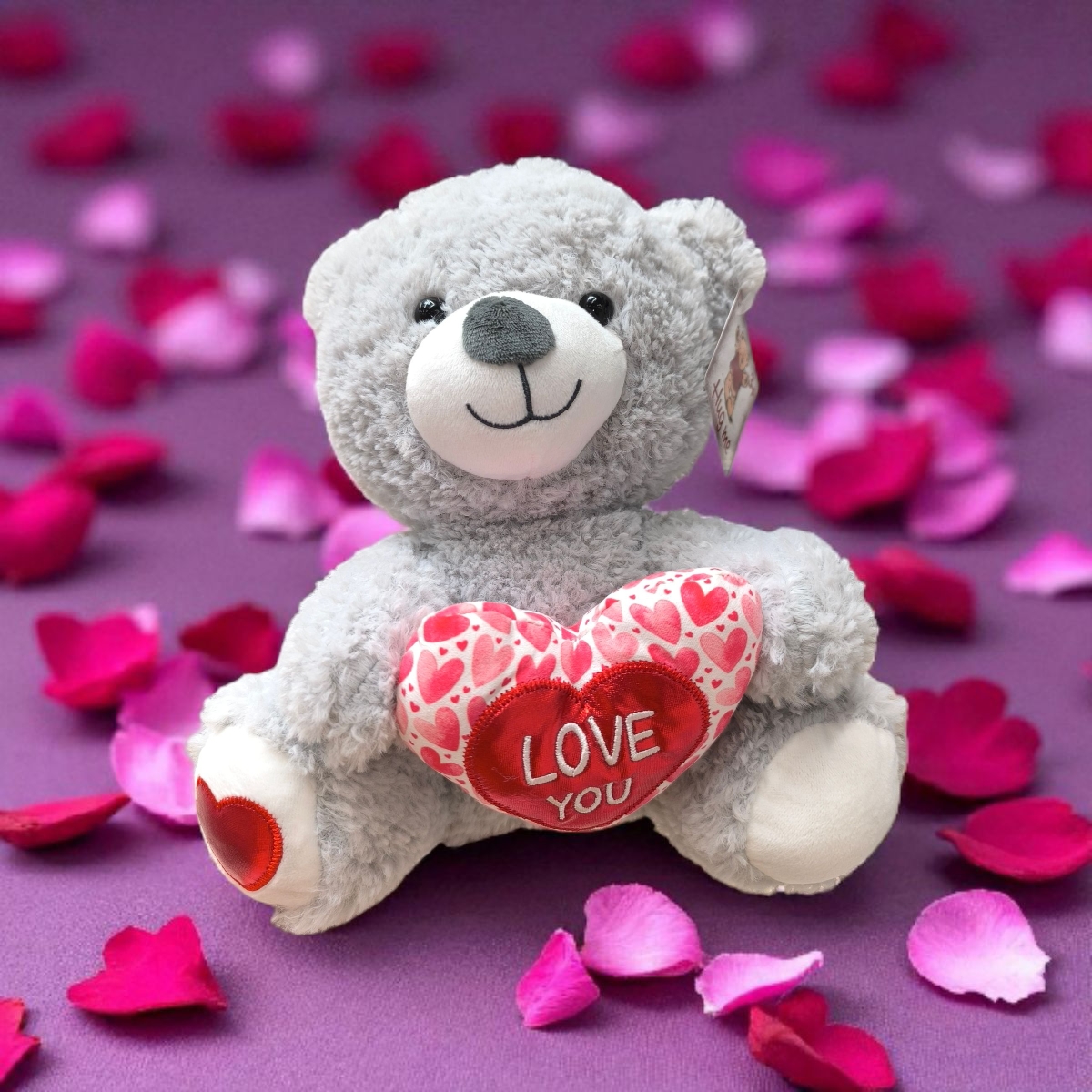Puha tapintású szürke plüss mackó piros és rózsaszín szívvel, fólia részletekkel és “I Love You” hímzéssel.