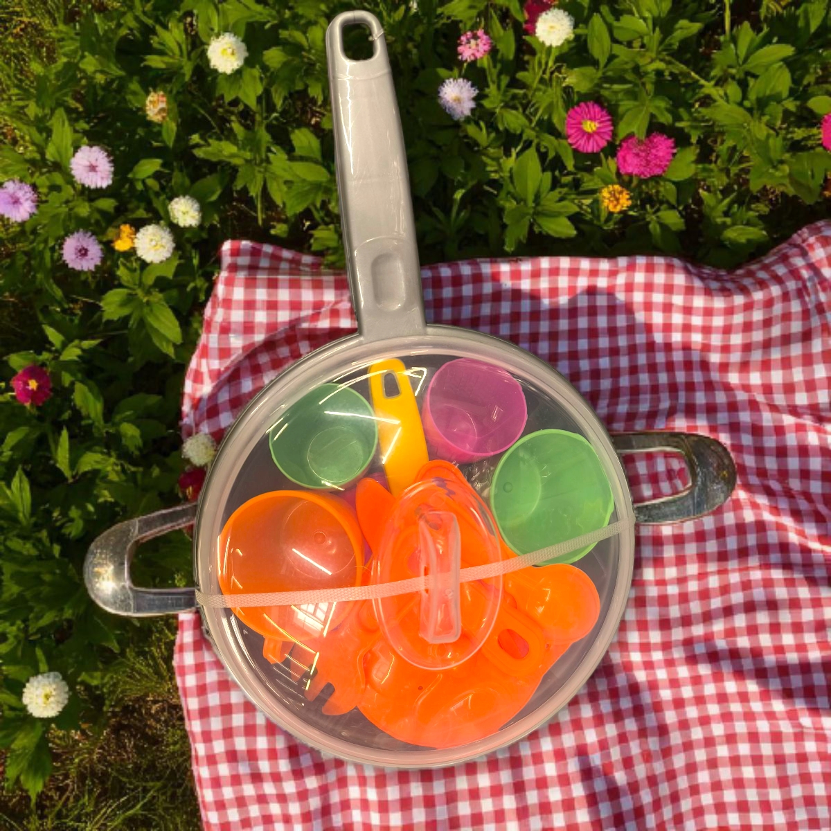 Tartalom: 2 csésze, 2 pohár, 2 tányér, kés, kanál, villa, spatula, 1 serpenyő fedéllel (18 cm), 1 nagy szürke serpenyő fedéllel (31,5 cm)