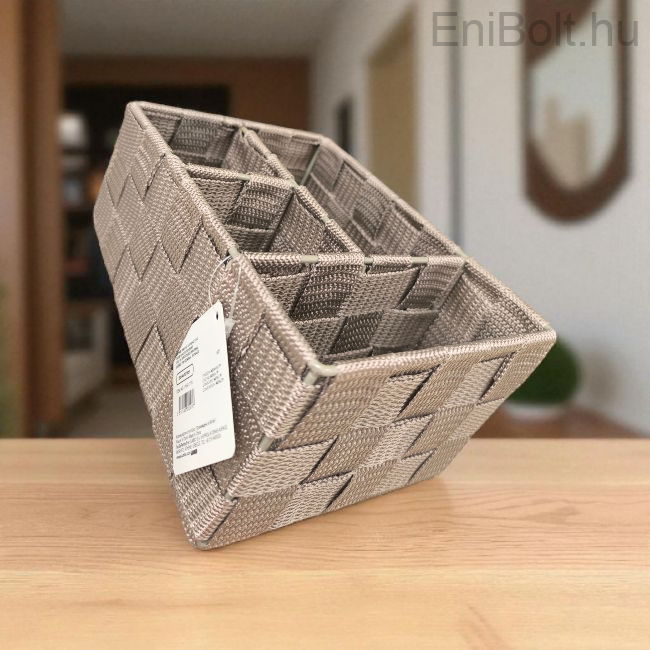 A szürkésbarna rattan hatású, fémkeretes tárolókosár 4 praktikus rekesszel rendelkezik, így kiválóan alkalmas kisebb tárgyak, írószerek, kozmetikumok vagy konyhai eszközök rendszerezésére. A különböző méretű rekeszek (1 db 14,5×7×9,5/8 cm, 2 db 7×7×9,5/8 cm, 1 db 6×14×10/9,5 cm) segítenek a könnyű áttekinthetőségben. Strapabíró fém váza és polipropilén fonott mintája elegáns, természetes hatást kölcsönöz, miközben hosszú élettartamot biztosít.