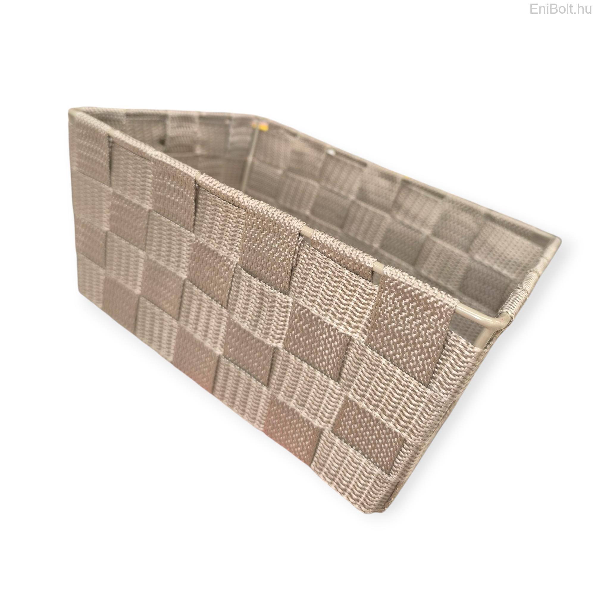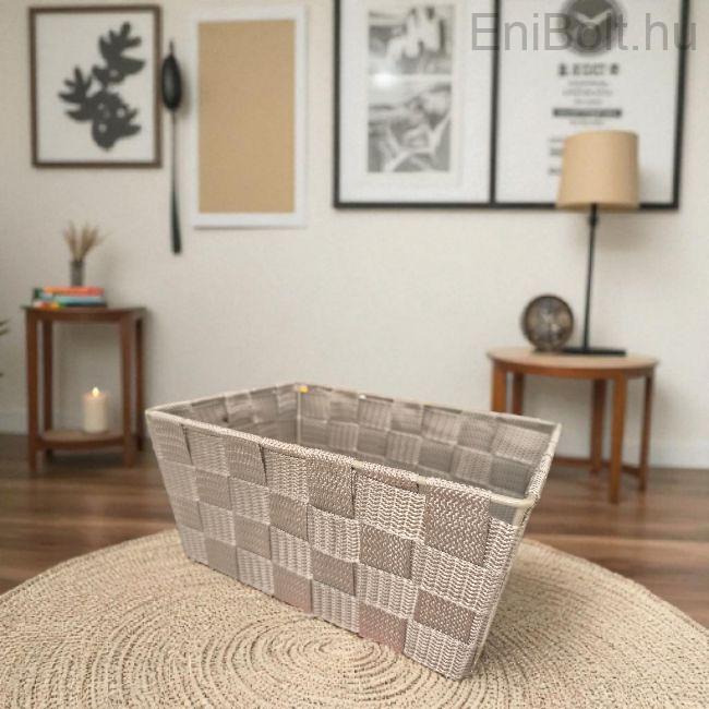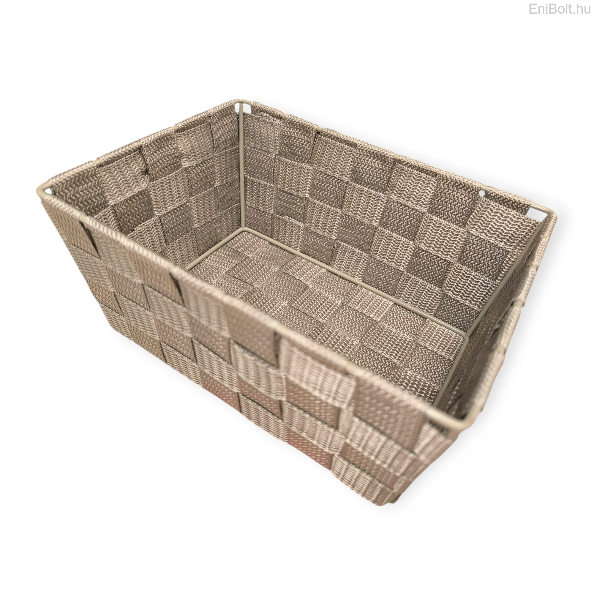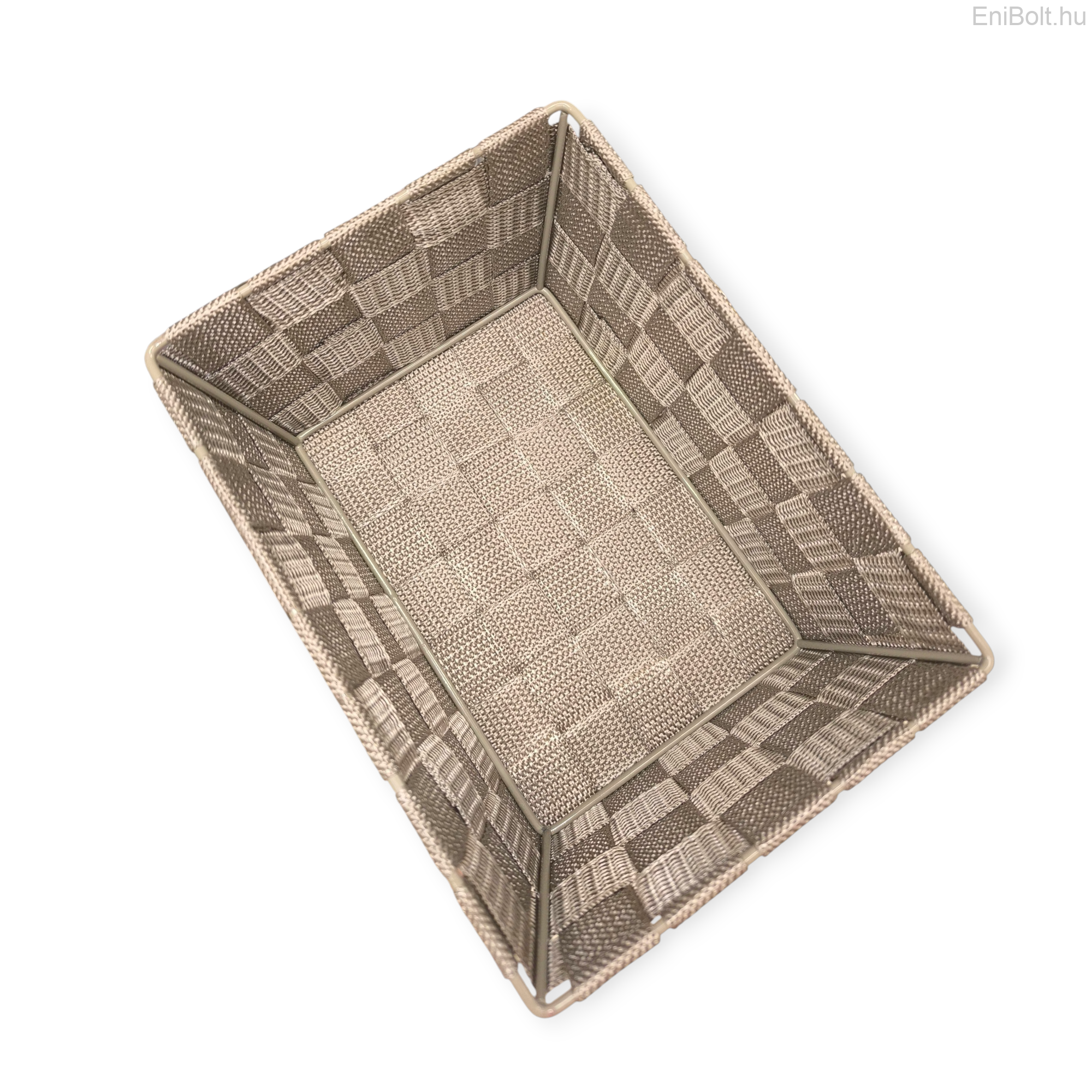 A szürkésbarna (taupe) fonott tárolókosár fém vázzal elegáns és praktikus kiegészítő otthonod rendszerezéséhez. Közepes, 22×16×10 cm-es méretével ideális kisebb háztartási tárgyak, irodai eszközök vagy kozmetikumok tárolására. Fonott hatású polipropilén borítása természetes megjelenést biztosít, míg masszív fém váza tartós használatot garantál. Tökéletes választás polcokra, komódokra vagy akár fürdőszobai tárolónak.