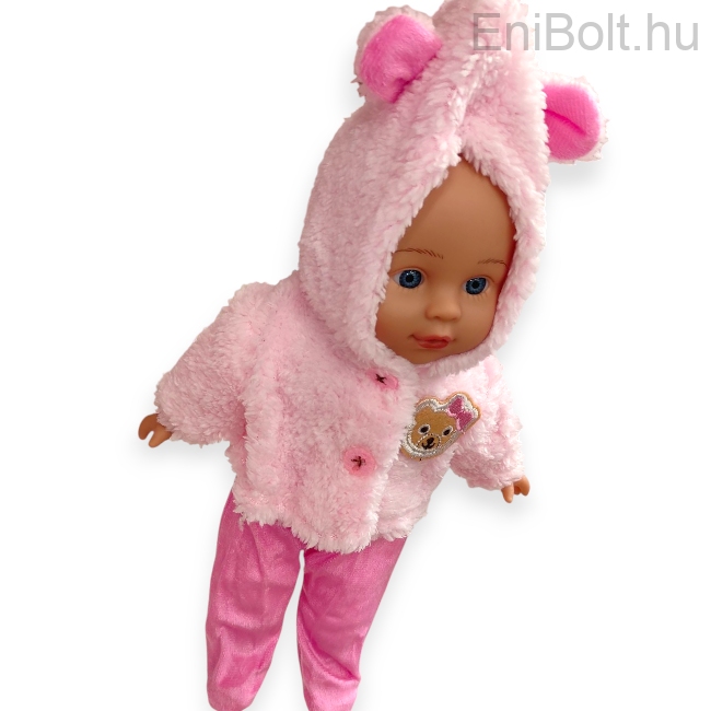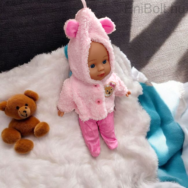 Ez a bájos Teddy Bear plüss baba tökéletes választás minden kis hercegnő számára! A baba 30 cm-es méretével ideális játszótárs, mackóruhába öltözve, rózsaszín nadrággal és kapucnival, füllel ellátott mellénnyel. A puha poliészter anyag garantálja a kényelmet, miközben szórakoztatja és elbűvöli a kicsiket.