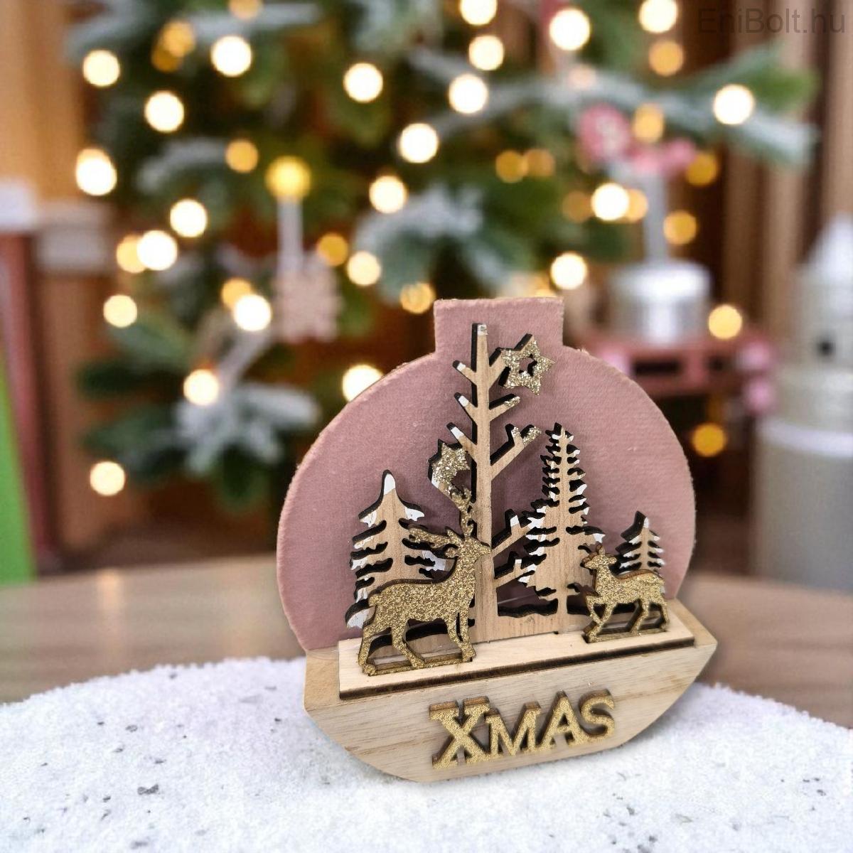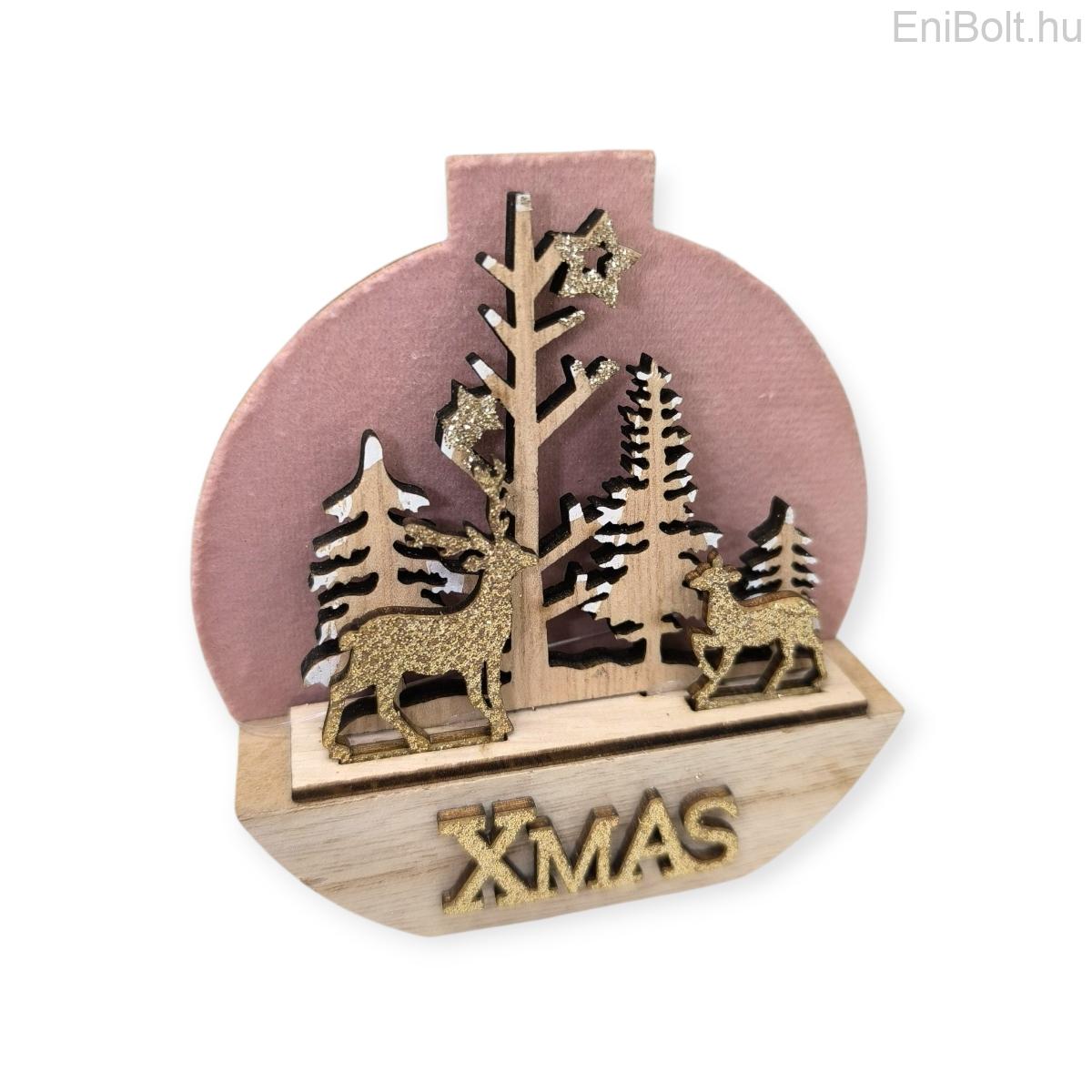 Karácsonyi dekoráció gömb formában, fa alapból, rózsaszín szőrmével és aranyos rénszarvassal.