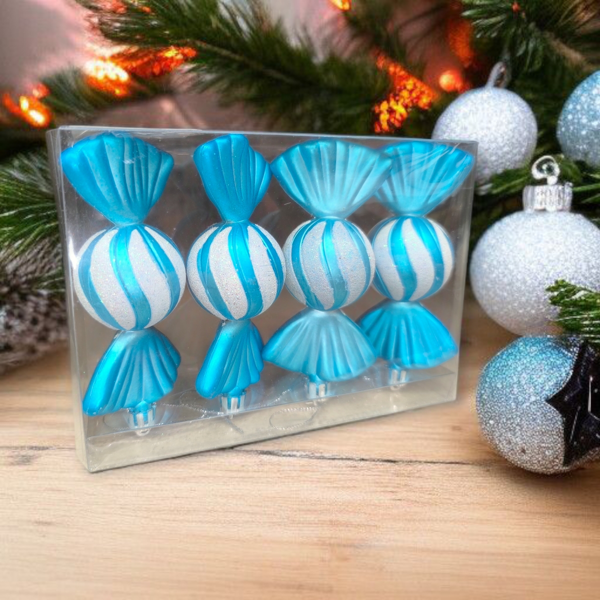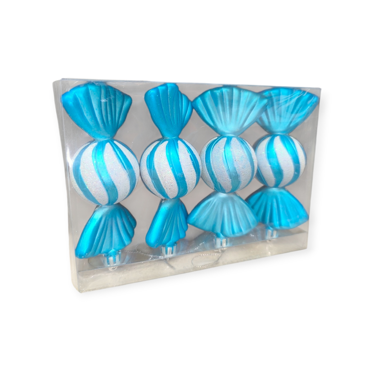 Egyedi türkiz cukorka alakú karácsonyfadíszek irizáló, csillogó csíkokkal. A szett 4 darab, 12 cm-es dekorációt tartalmaz, amelyek játékos és elegáns fényt adnak a fának.
