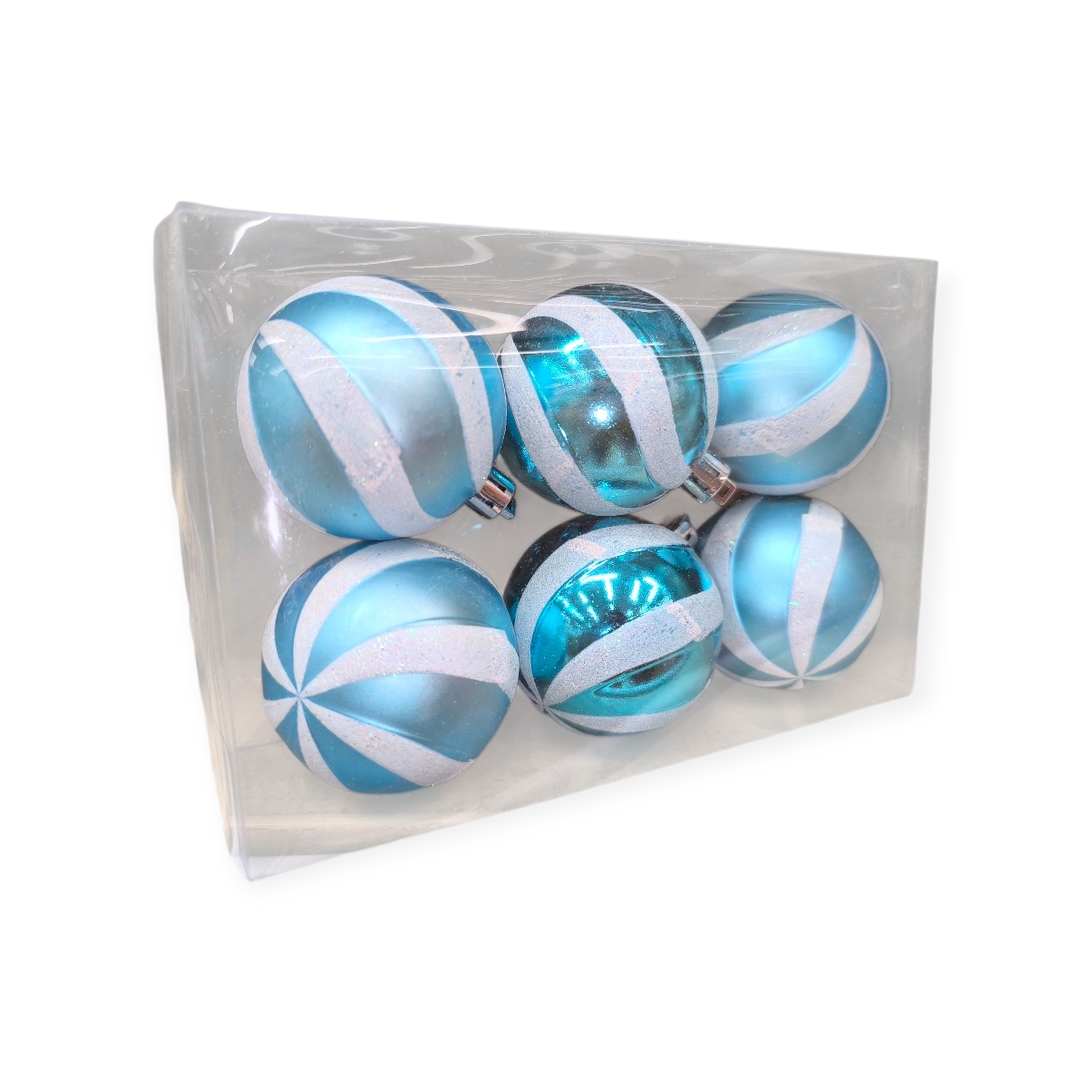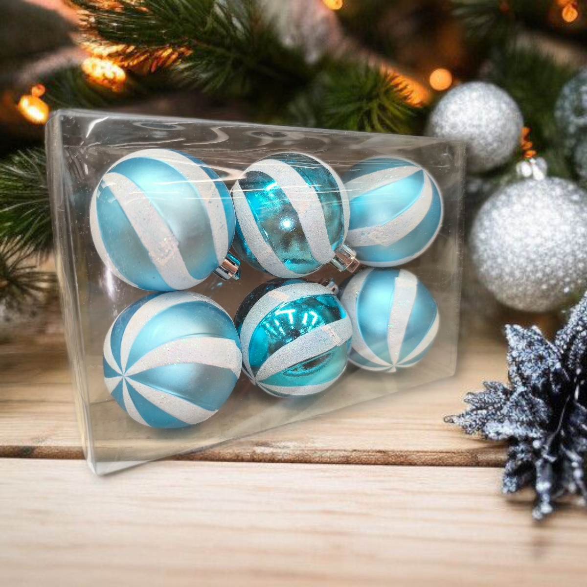 Stílusos türkiz karácsonyfa gömbök fehér csíkos mintával és irizáló csillogással. A szett 6 darab, 6 cm-es díszt tartalmaz, amelyek friss, elegáns hangulatot kölcsönöznek a fának.