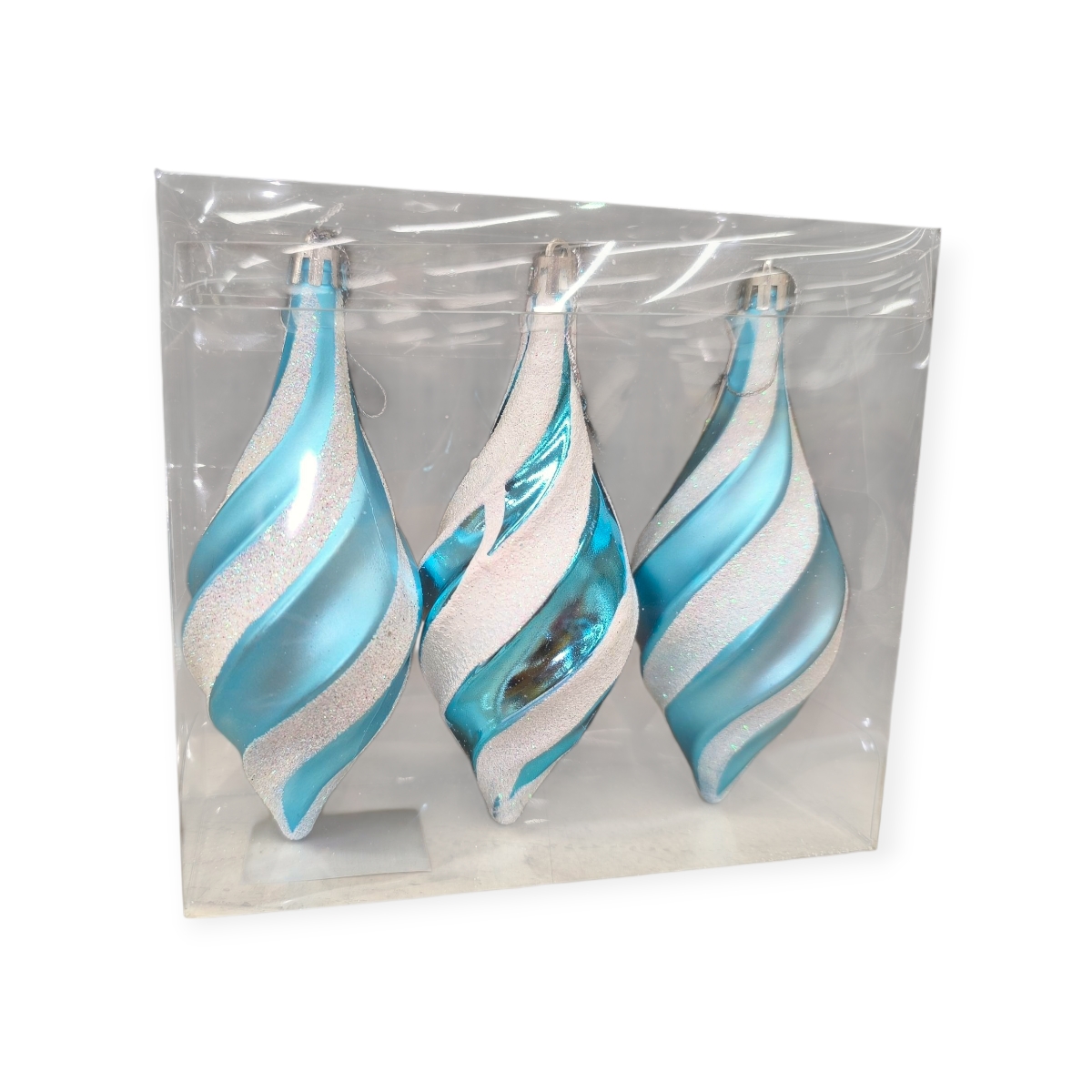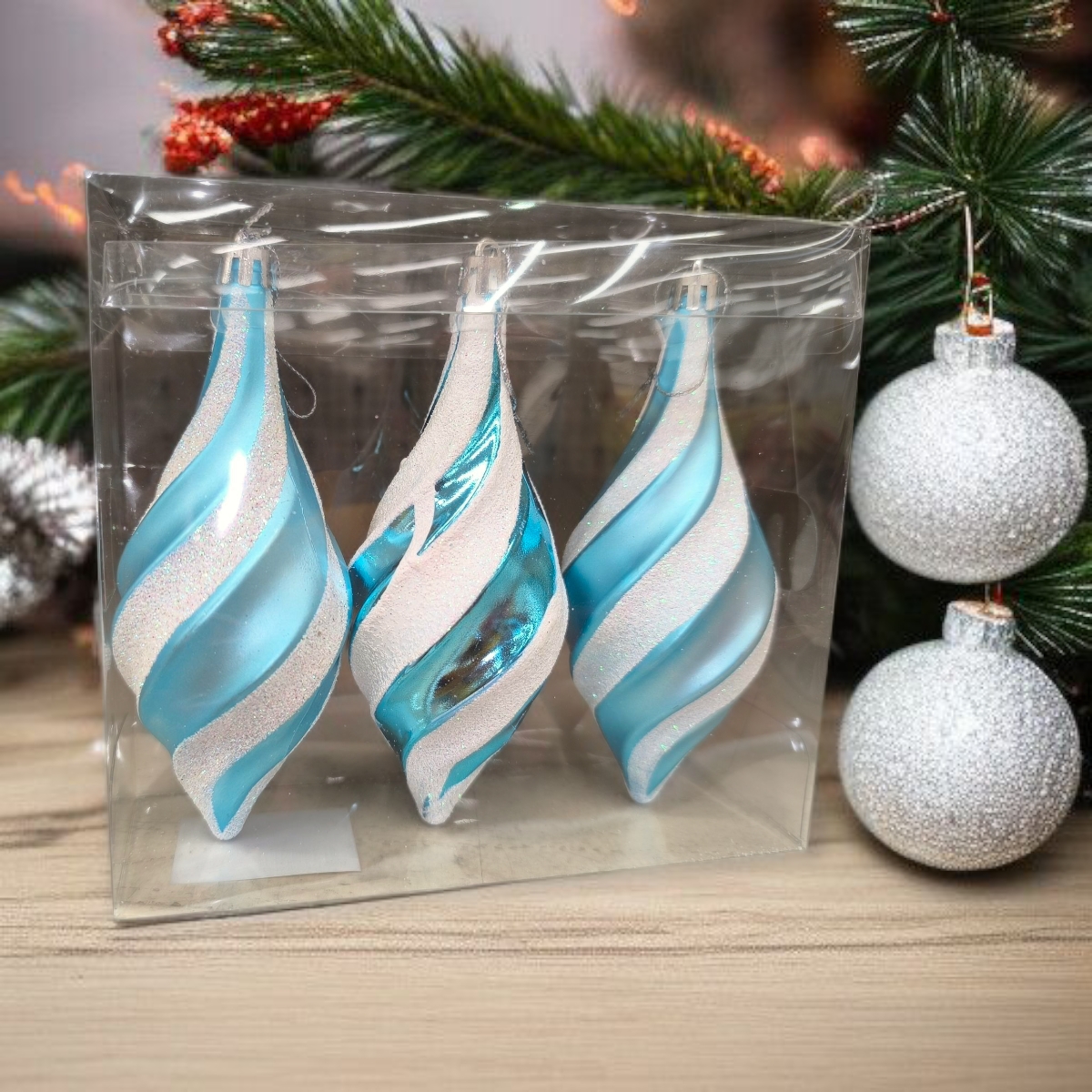 Stílusos türkiz karácsonyfa csepp alakú díszek holografikus csíkokkal és fehér csillogással. A szett 3 darab, 14 cm-es dekorációt tartalmaz, amelyek modern és elegáns fényt visznek a karácsonyfára.