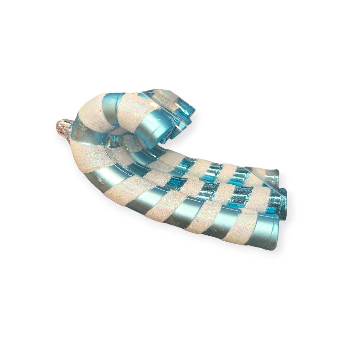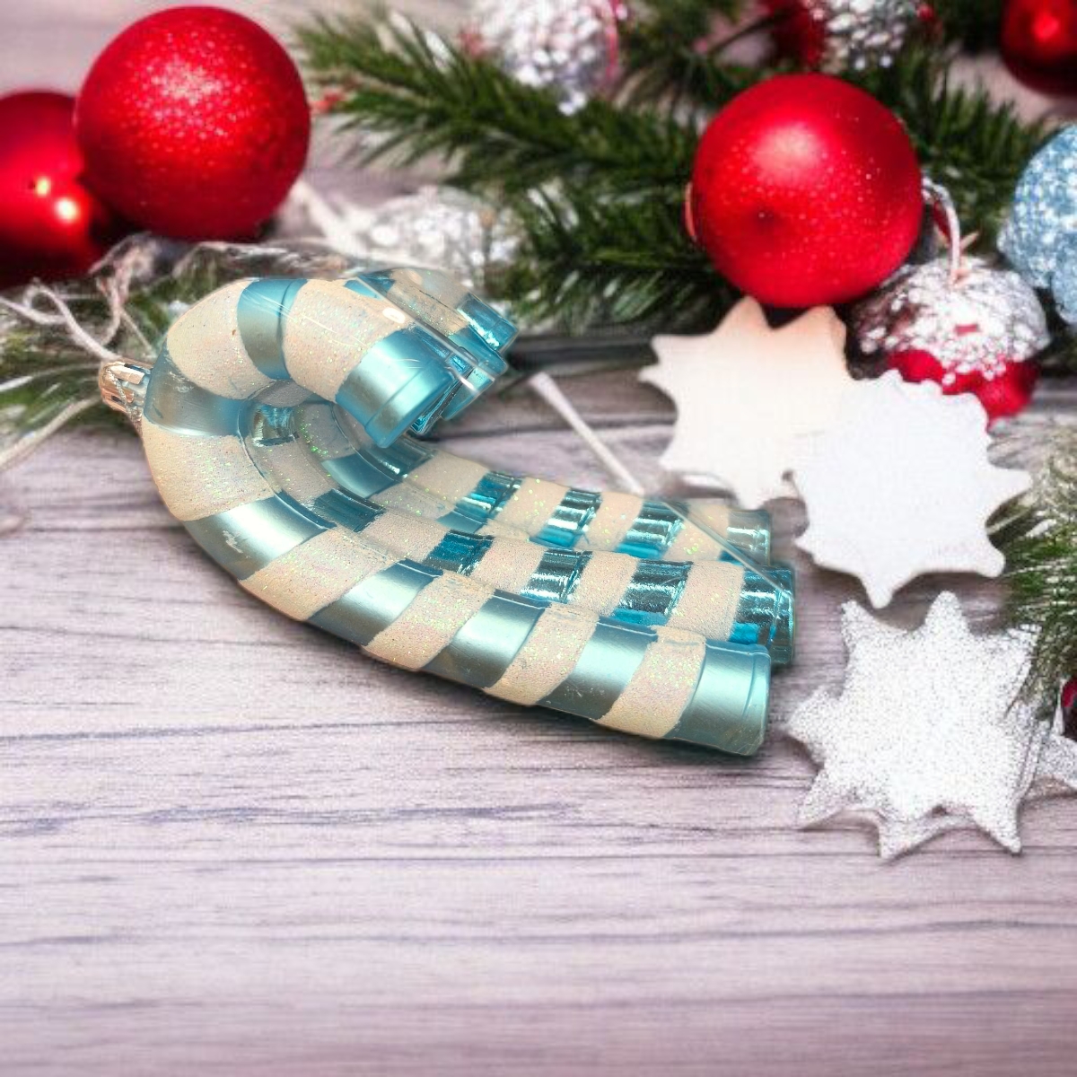 Elegáns türkiz karácsonyfadíszek fehér csíkokkal és holografikus csillogással. A szett 4 darab, 14 cm-es dekorációt tartalmaz, amelyek látványosan kiemelik a fa szépségét és ünnepi hangulatát.