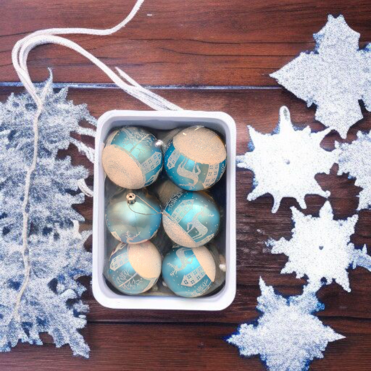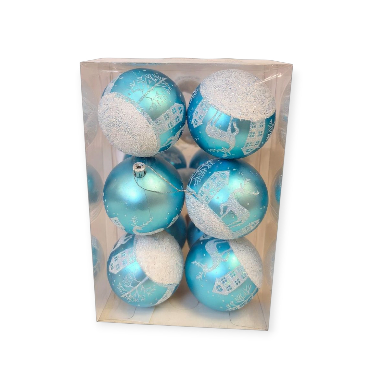 Különleges türkiz karácsonyfa gömbök, havas táj mintával és finom csillogással. A szett 6 darab, Ø8 cm-es díszt tartalmaz, amelyek egyedivé és ragyogóvá teszik a karácsonyfát.