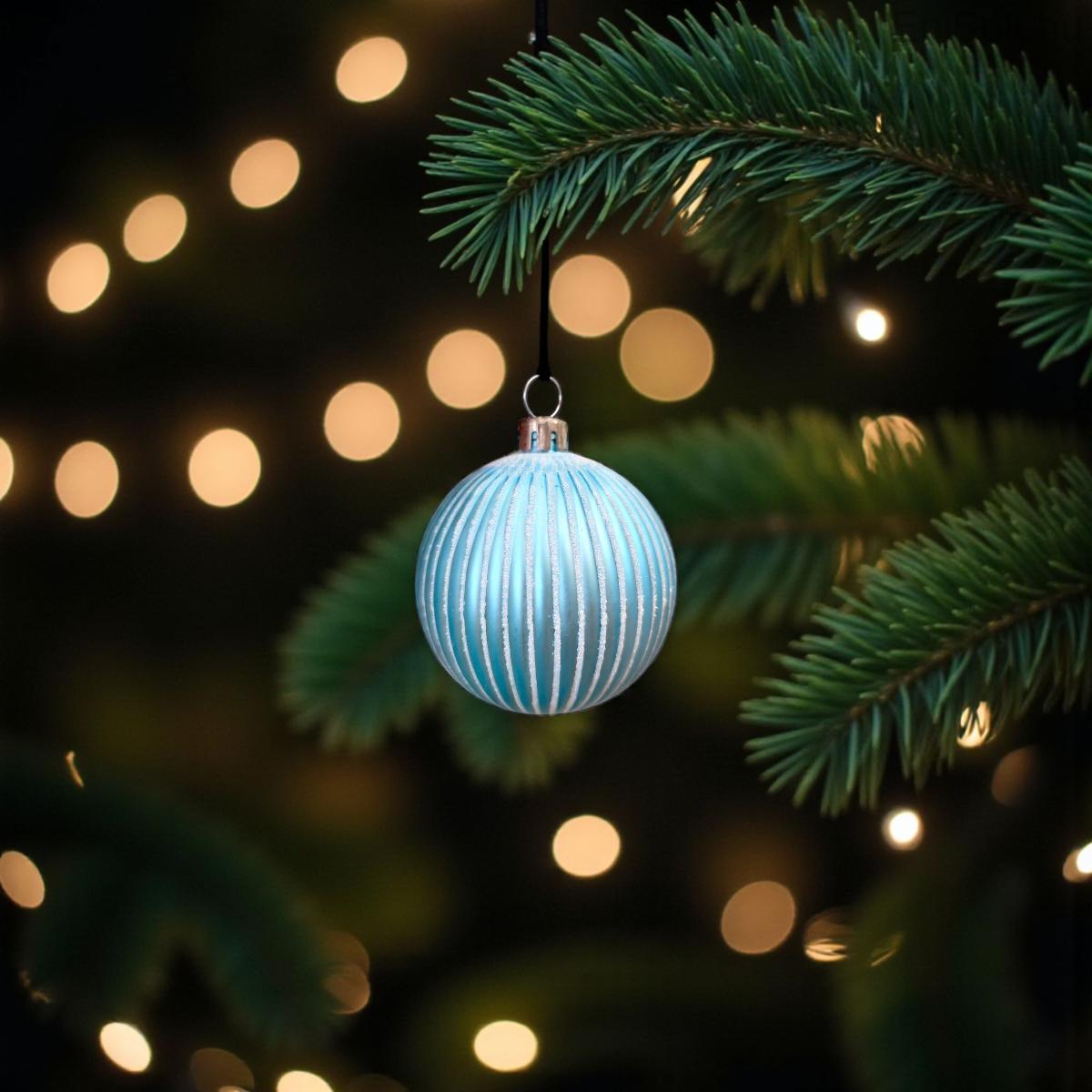 Elegáns türkiz karácsonyfagömb, matt fehér csíkokkal és finom, irizáló csillogással. Modern és ünnepi hangulatot kölcsönöz a karácsonyfának.