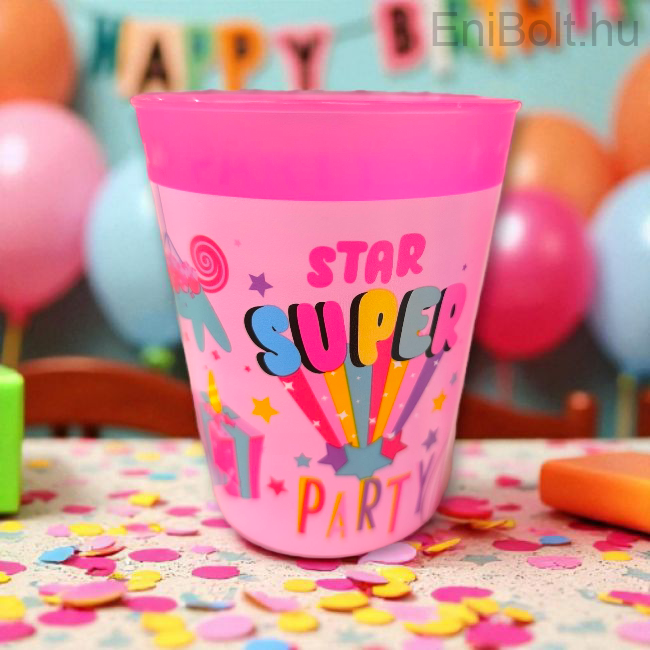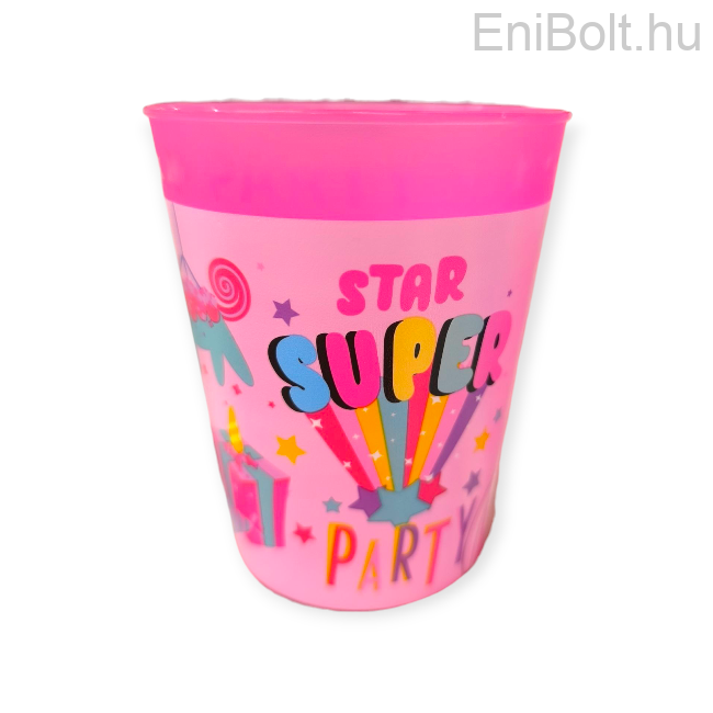 Praktikus és vidám rózsaszín műanyag party pohár, amelyet unikornis minta és a "Super Star Party" felirat díszít. Újrafelhasználható kialakítása környezetbarát és tartós megoldást kínál gyerekzsúrokhoz, születésnapi bulikhoz vagy otthoni használathoz. BPA-mentes műanyagból készült, biztonságosan használható a gyerekek számára is.