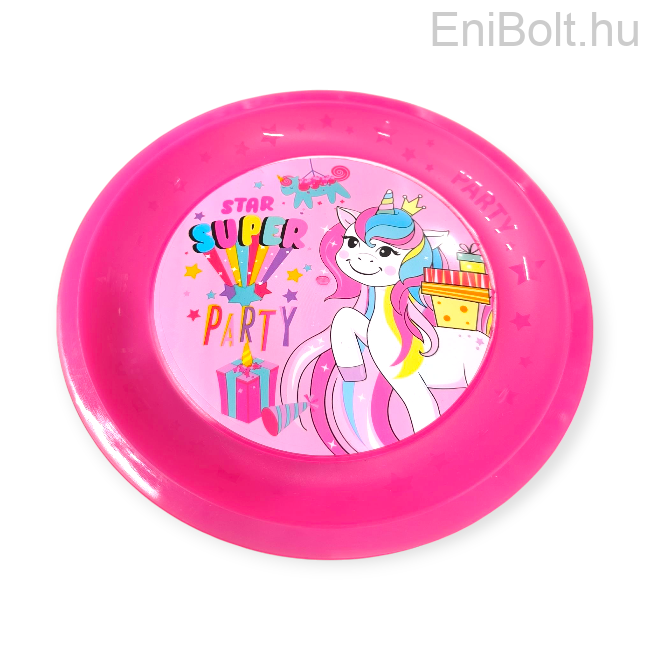 Praktikus és vidám rózsaszín műanyag tányér unikornis mintával és „Super Party” felirattal. BPA-mentes, így biztonságos a gyermekek számára, ráadásul többször használható, így környezetbarát választás születésnapokra és gyerekzsúrokra. Strapabíró és könnyen tisztítható kialakítása miatt ideális mindennapi használatra is.