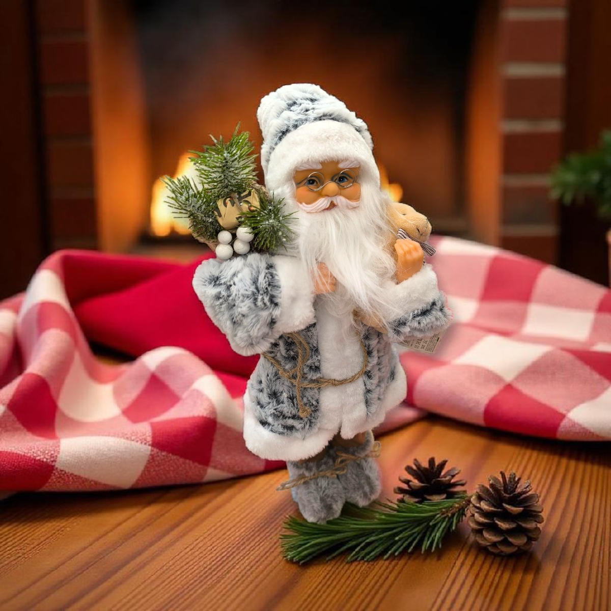 Bájos, valósághű Mikulás figura, amely szürke-fehér öltönyben, kesztyűben, ajándékokkal teli táskával és aranyos kis mackóval érkezik. A 30 cm magas dekoráció tökéletes választás az ünnepi hangulat megteremtésére, akár a nappaliban, komódon vagy ablakpárkányon elhelyezve. Részletgazdag kidolgozásával és puha szőrmeszegélyével a karácsony meghitt varázsát hozza el otthonodba.