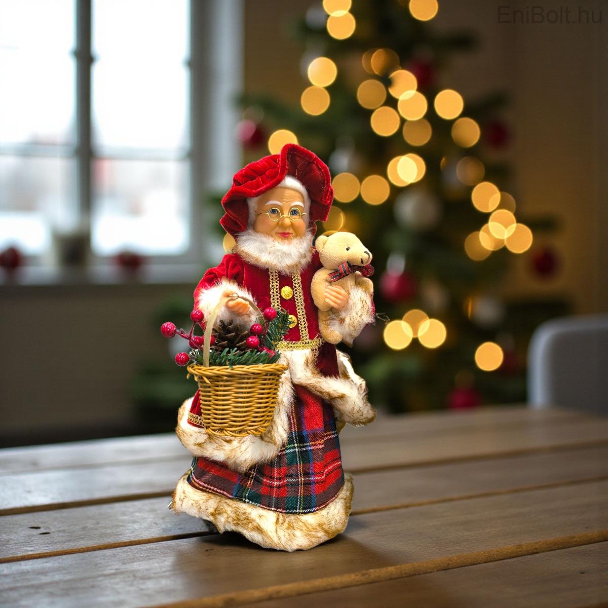 Ez a gyönyörű, valósághű Télanyó figura tökéletes kiegészítője a karácsonyi dekorációnak. Piros kabátot és kockás szoknyát visel, melyet puha műszőrme díszít. Kezében fonott kosarat és aranyos plüssmackót tart, fején bársonyos kalap teszi teljessé az ünnepi megjelenést.