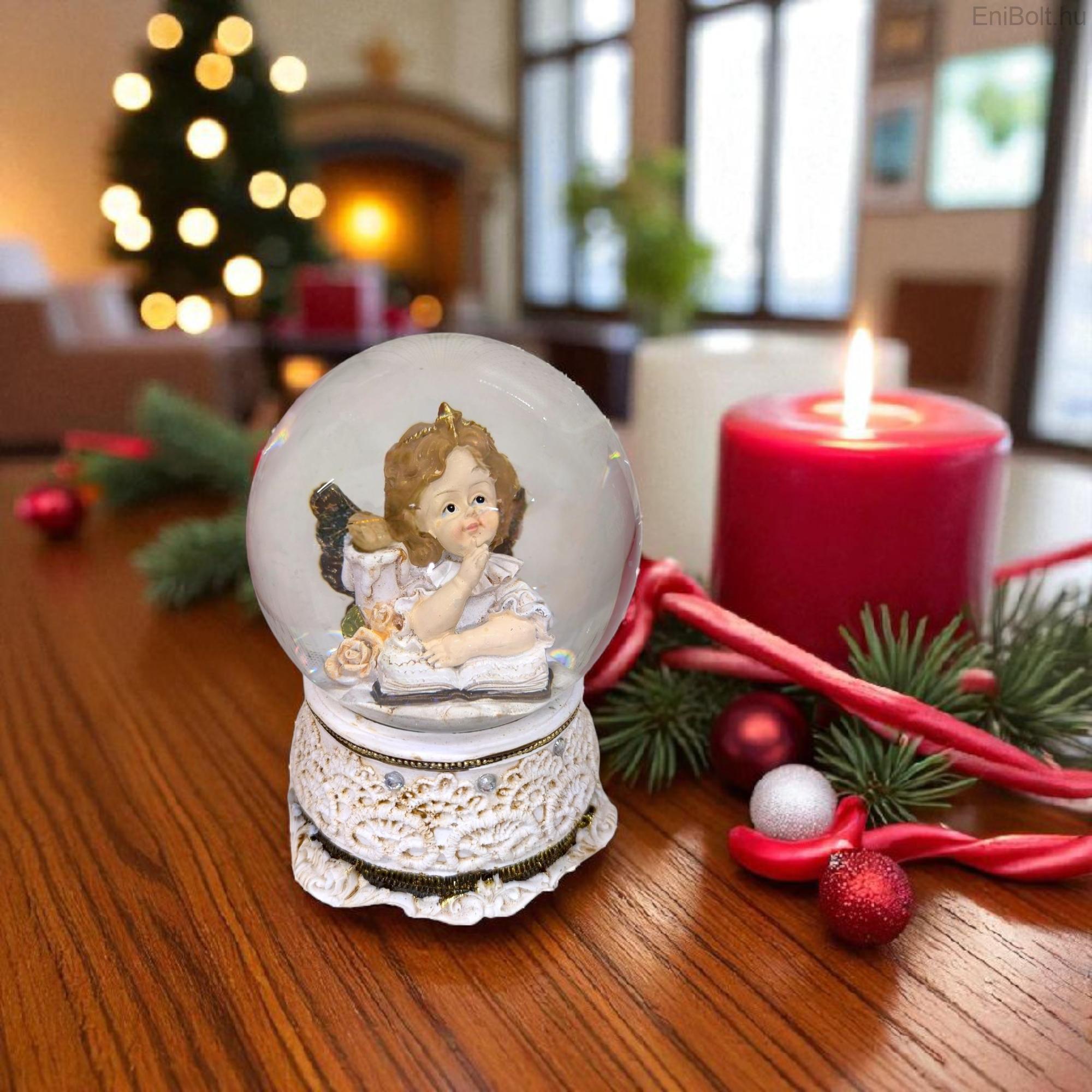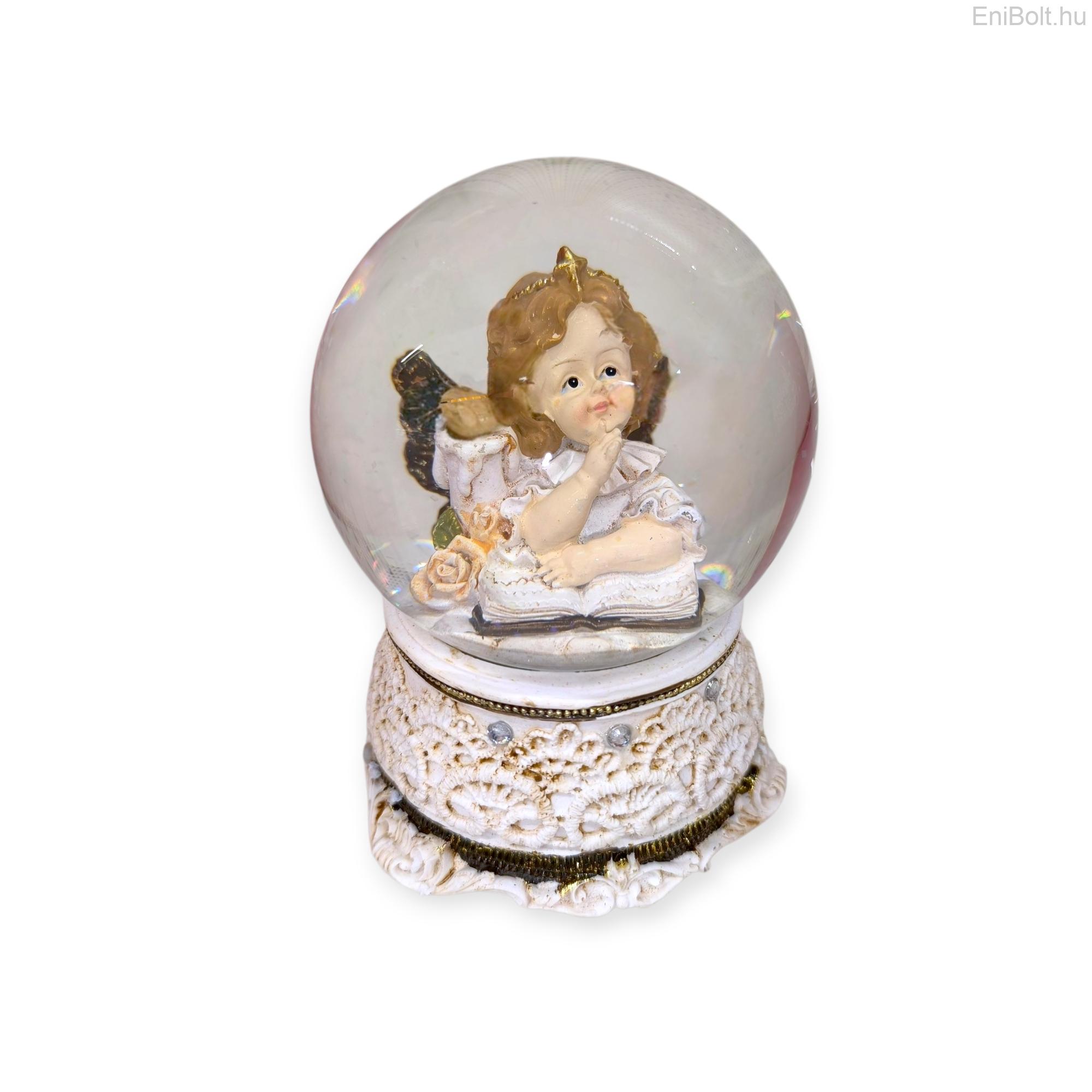 Elegáns, zenélő karácsonyi hógömb vintage stílusban. A dísz belsejében szárnyas angyal látható, könyvvel a kezében, finom csillámpelyhek között.