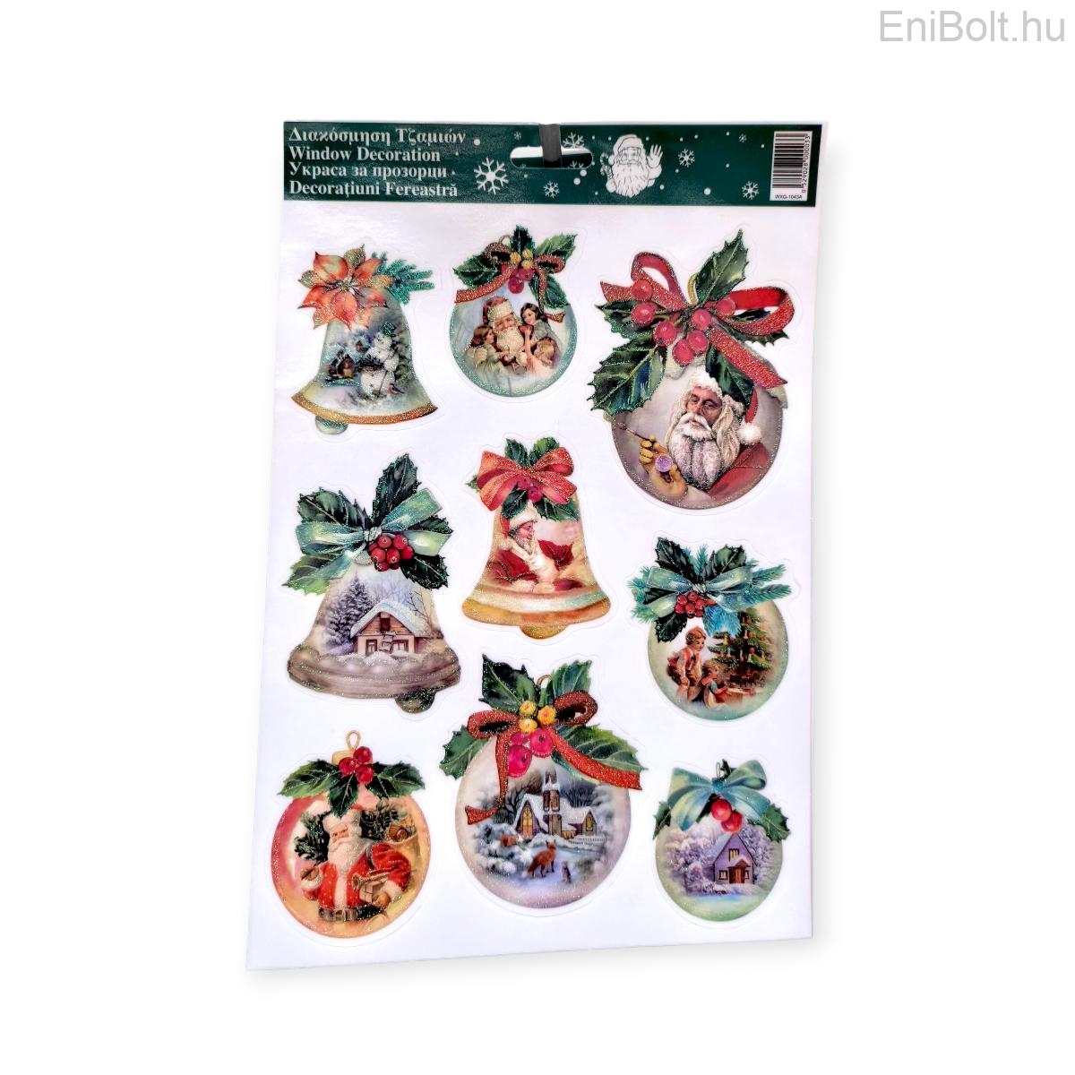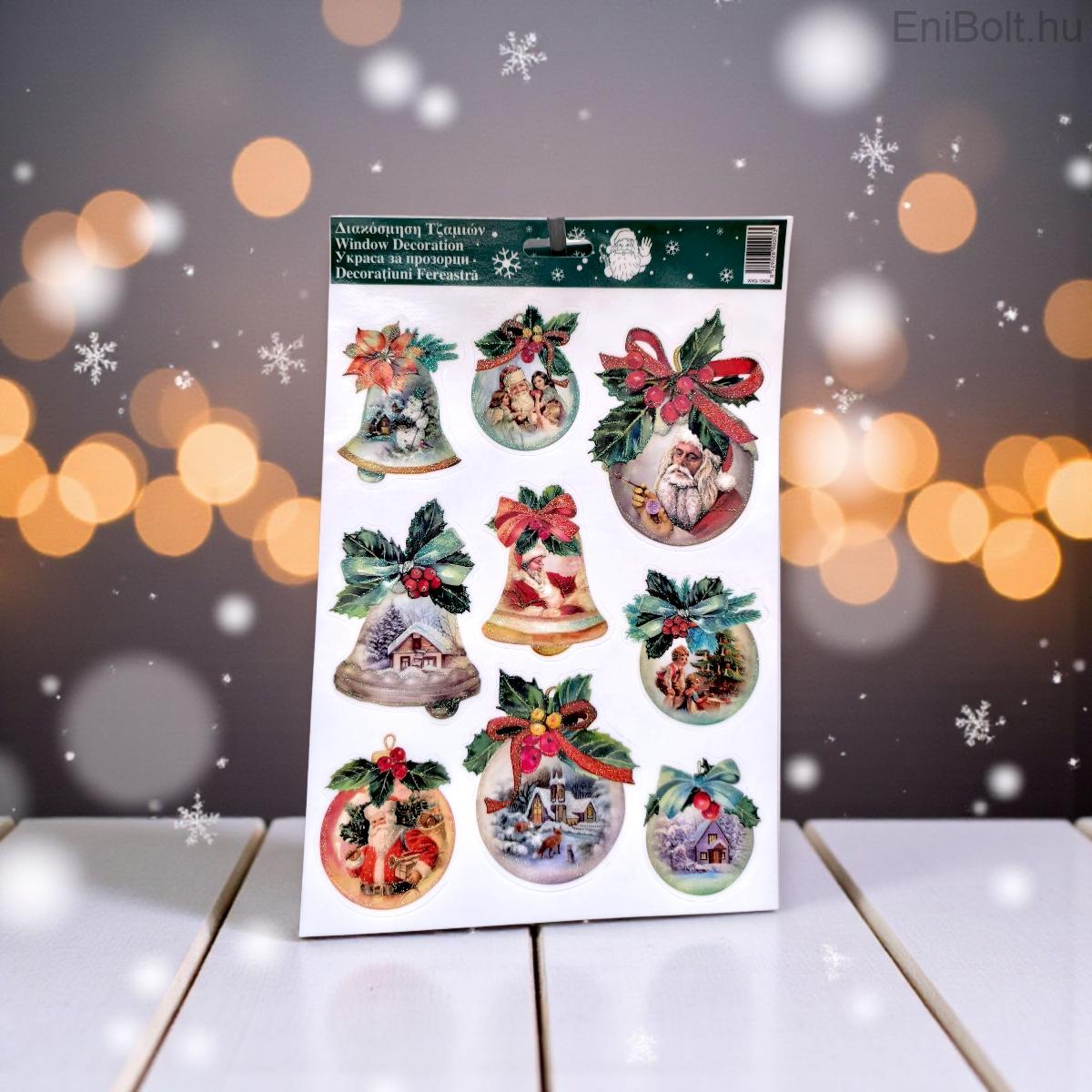 Vintage karácsonyi ablakmatrica harangokkal és gömbökkel 20x30cm