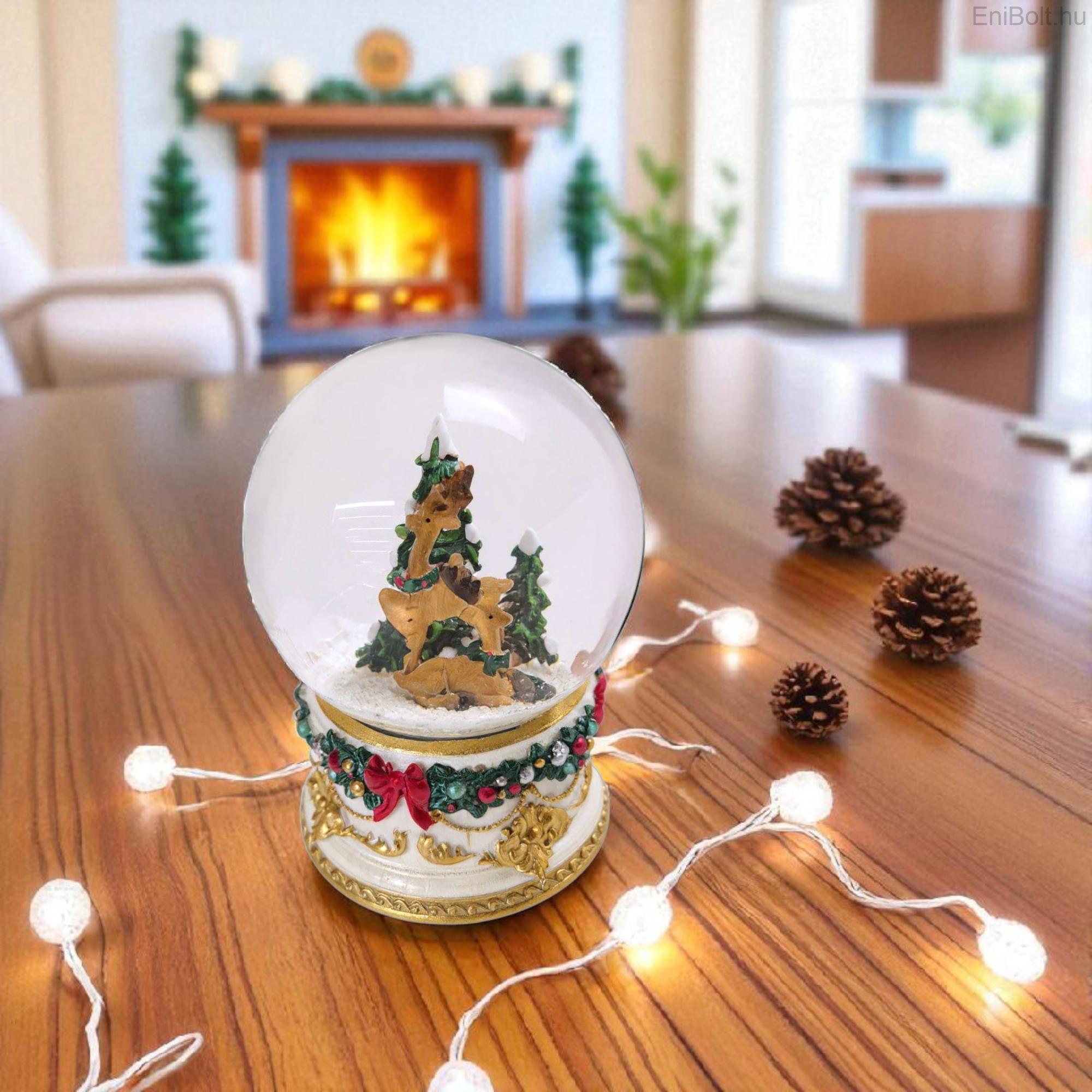 A Vintage rénszarvas zenélő karácsonyi hógömb elegáns, nosztalgikus stílusú ünnepi dekoráció, amely melegséget és meghittséget visz otthonába. A hógömb belsejében bájos rénszarvasok állnak egy feldíszített karácsonyfa előtt, miközben a hógolyó finoman forog a dallamos zene kíséretében.