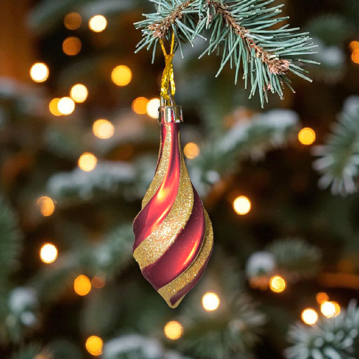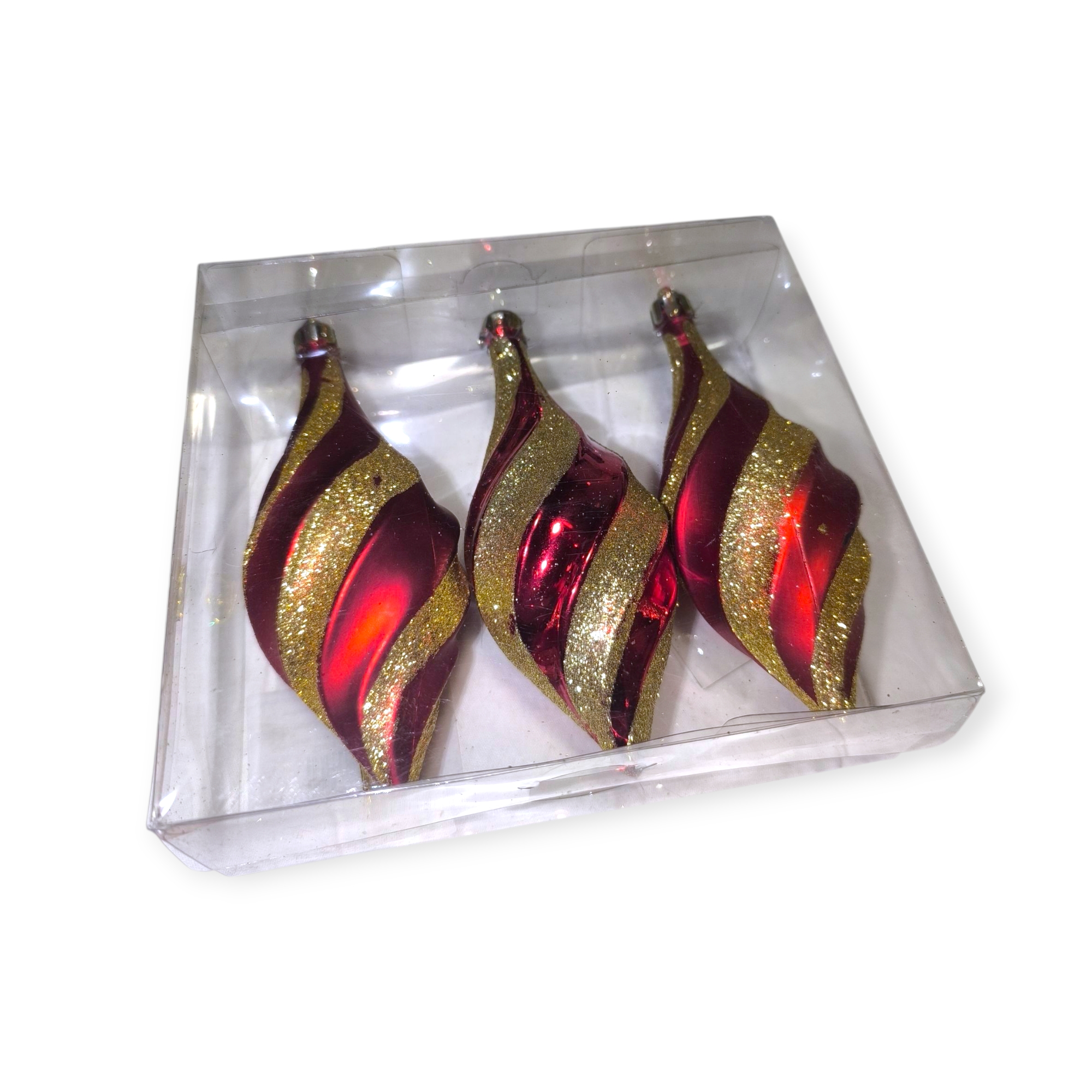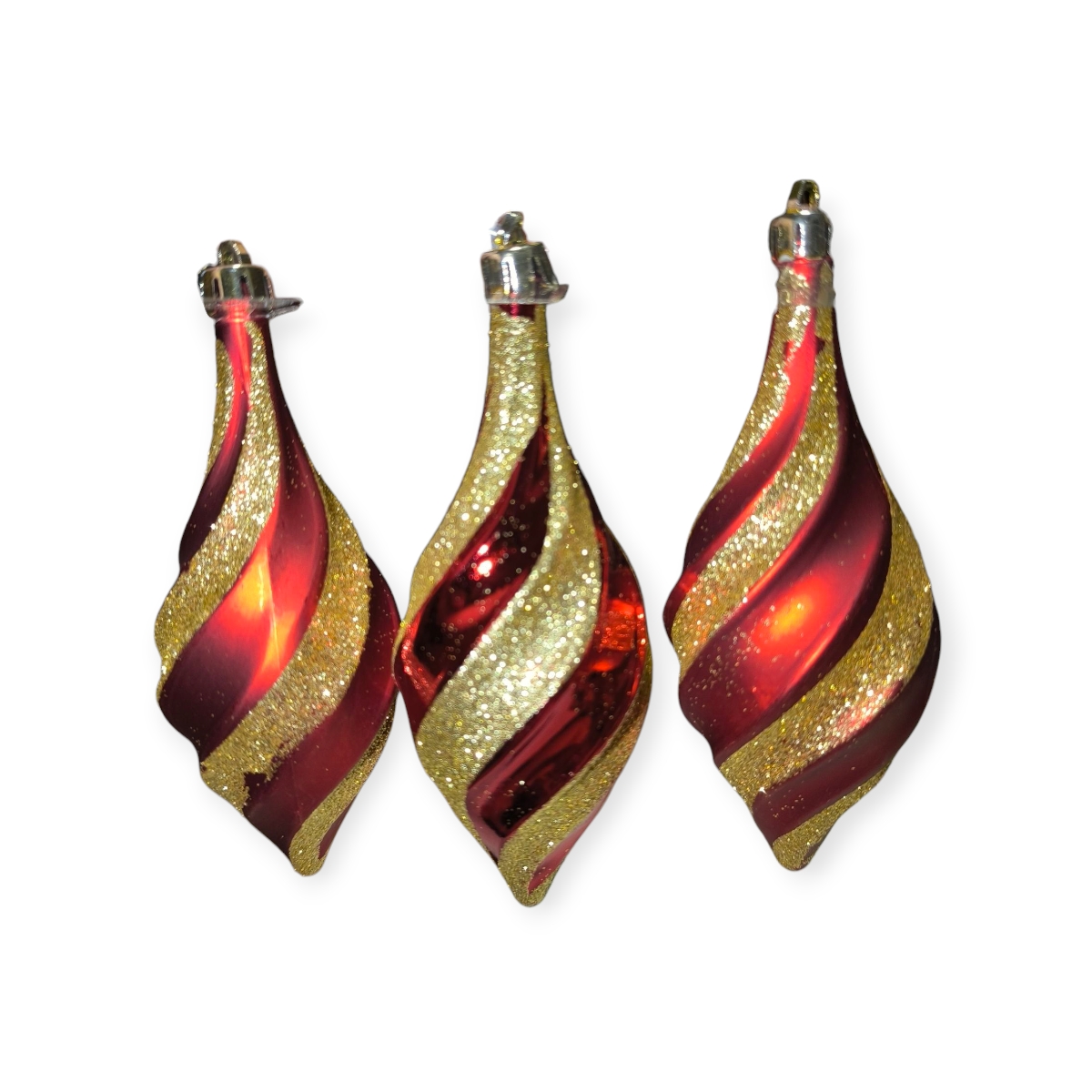 Elegáns vörös-arany kúp alakú karácsonyfa díszek, melyek fényes és matt felülettel, valamint arany csillogó csíkkal díszítettek. A készletben 3 darab, 14 cm-es műanyag dísz található, amelyek vintage stílusukkal feldobják a karácsonyfát.
