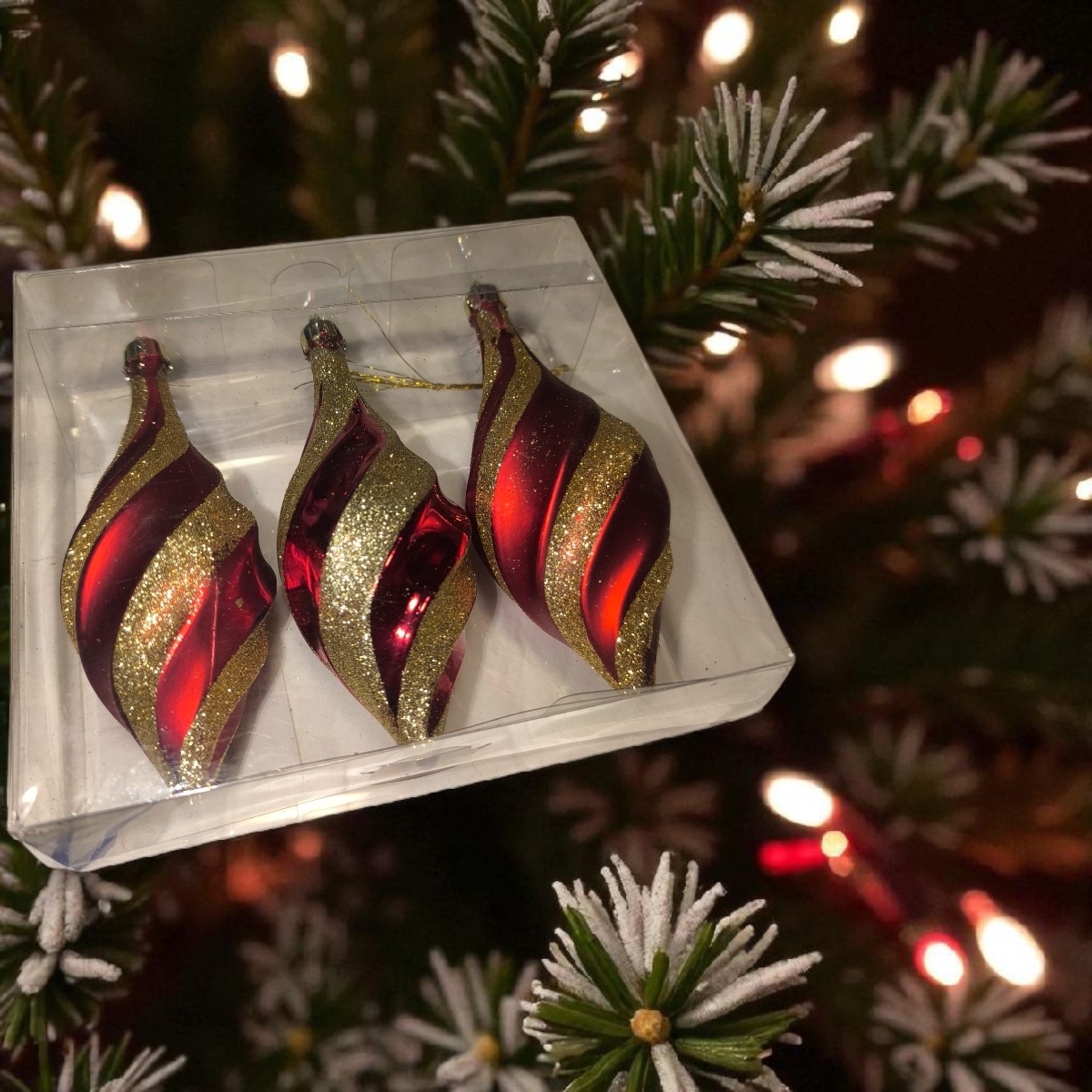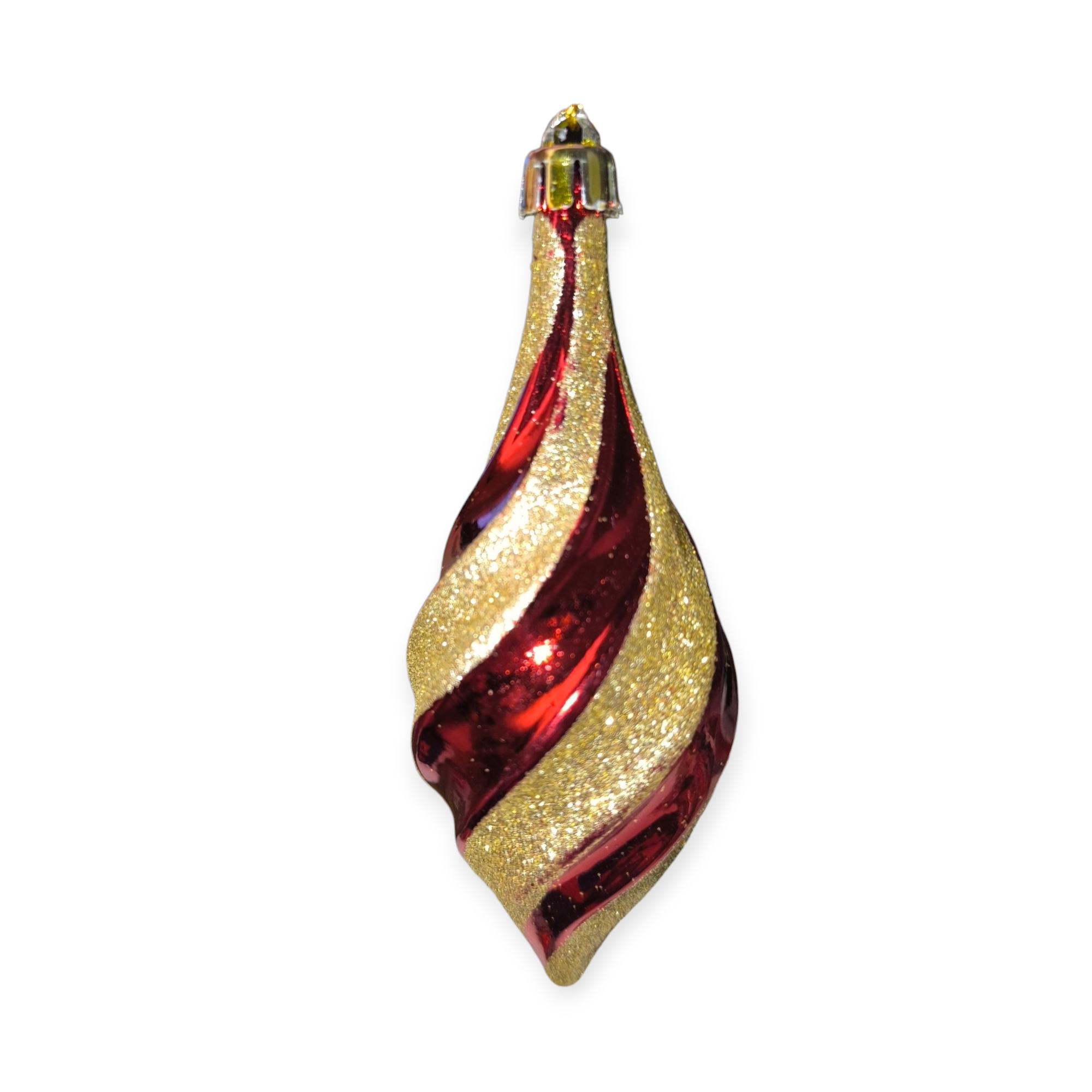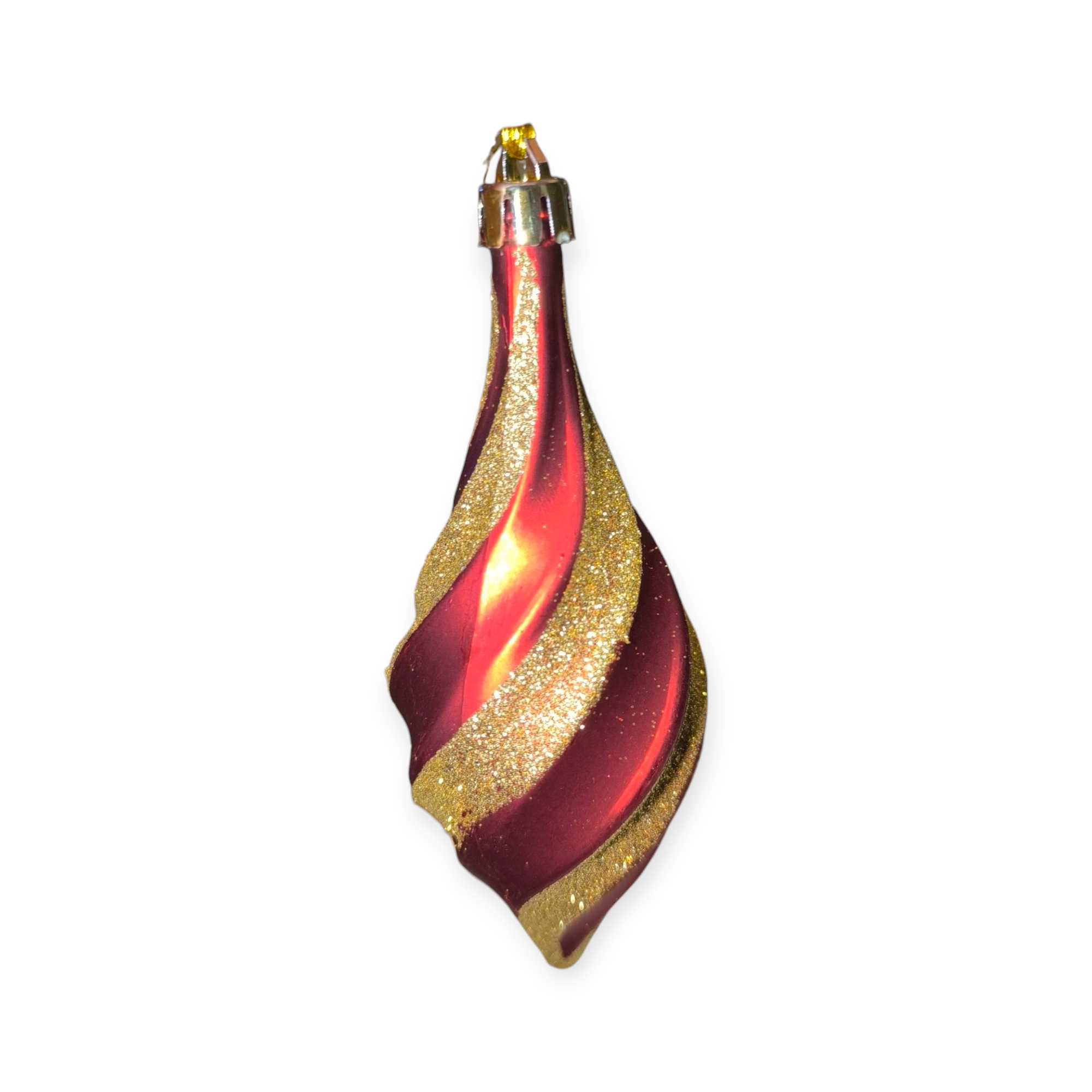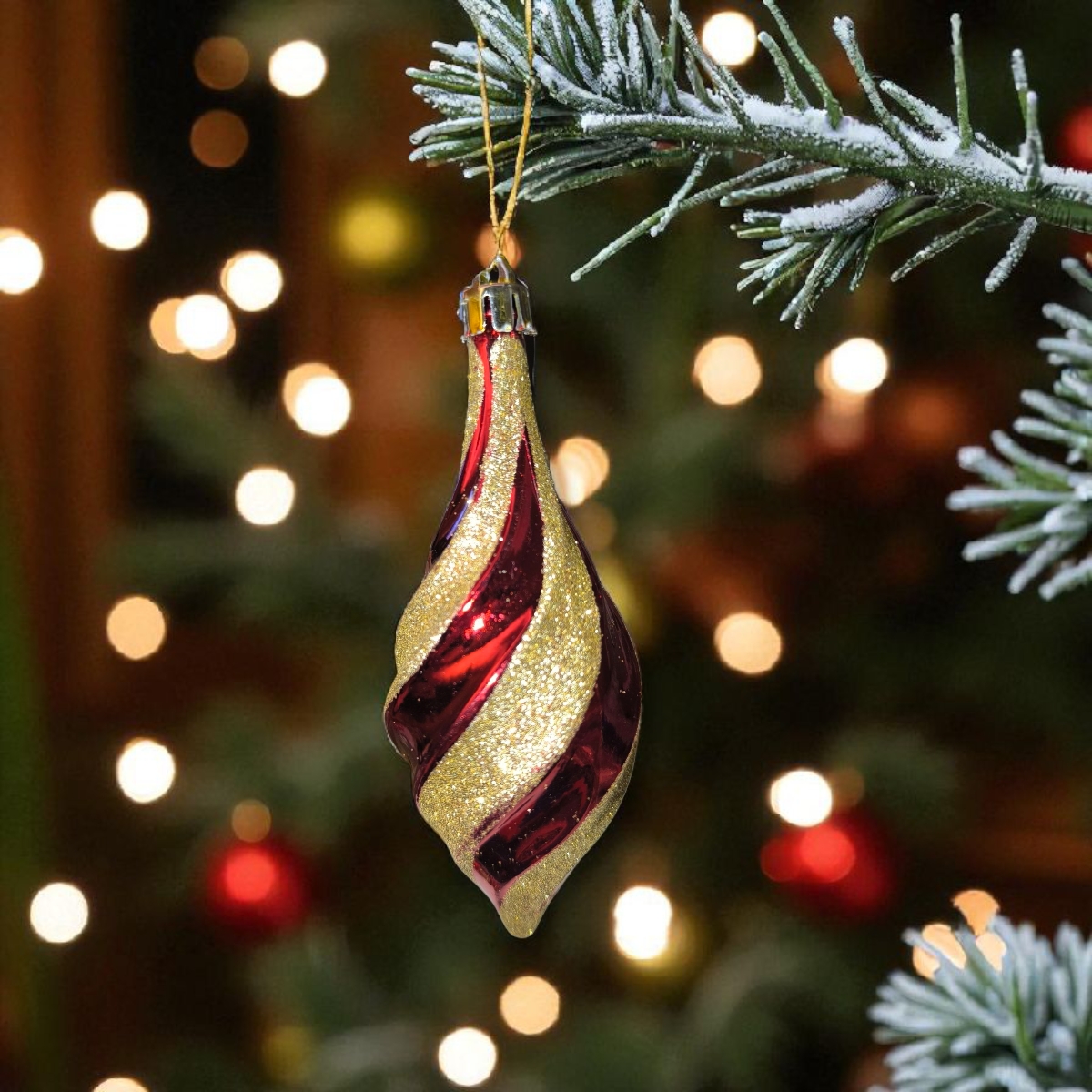 Elegáns vörös-arany kúp alakú karácsonyfa díszek, melyek fényes és matt felülettel, valamint arany csillogó csíkkal díszítettek. A készletben 3 darab, 14 cm-es műanyag dísz található, amelyek vintage stílusukkal feldobják a karácsonyfát.