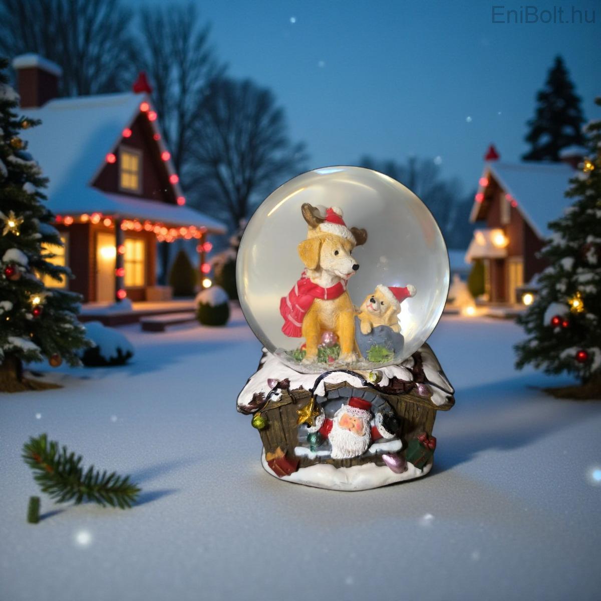 Teremts meghitt karácsonyi hangulatot ezzel a bájos zenélő hógömbbel, amelyben két aranyos kutyus és a Mikulás tűnik fel egy havas barna ház tetején. A részletgazdag kidolgozás, a finoman hulló hópelyhek és az ünnepi dallamok igazi karácsonyi varázst visznek otthonodba.