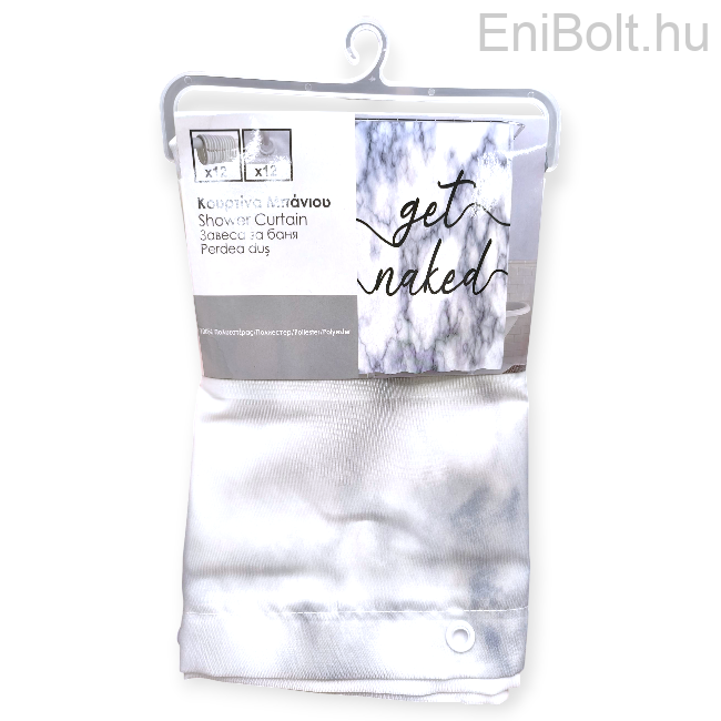 Zuhanyfüggöny szürke márványmintával és „meztelenül” felirattal – 180x180 cm, 12 gyűrűvel